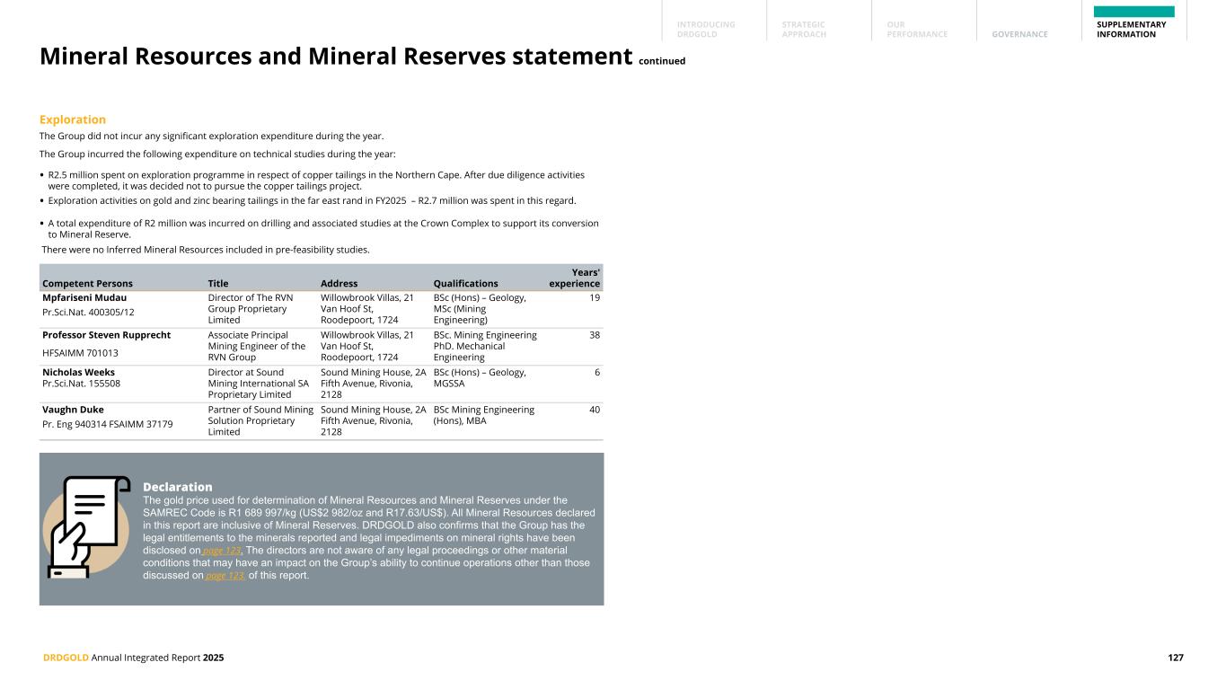 Exploration The Group did not incur any significant exploration expenditure during the year. The Group incurred the following expenditure on technical studies during the year: • R2.5 million spent on exploration programme in respect of copper tailings in the Northern Cape. After due diligence activities were completed, it was decided not to pursue the copper tailings project. • Exploration activities on gold and zinc bearing tailings in the far east rand in FY2025 – R2.7 million was spent in this regard. • A total expenditure of R2 million was incurred on drilling and associated studies at the Crown Complex to support its conversion to Mineral Reserve. There were no Inferred Mineral Resources included in pre-feasibility studies. Competent Persons Title Address Qualifications Years' experience Mpfariseni Mudau Pr.Sci.Nat. 400305/12 Director of The RVN Group Proprietary Limited Willowbrook Villas, 21 Van Hoof St, Roodepoort, 1724 BSc (Hons) – Geology, MSc (Mining Engineering) 19 Professor Steven Rupprecht HFSAIMM 701013 Associate Principal Mining Engineer of the RVN Group Willowbrook Villas, 21 Van Hoof St, Roodepoort, 1724 BSc. Mining Engineering PhD. Mechanical Engineering 38 Nicholas Weeks Pr.Sci.Nat. 155508 Director at Sound Mining International SA Proprietary Limited Sound Mining House, 2A Fifth Avenue, Rivonia, 2128 BSc (Hons) – Geology, MGSSA 6 Vaughn Duke Pr. Eng 940314 FSAIMM 37179 Partner of Sound Mining Solution Proprietary Limited Sound Mining House, 2A Fifth Avenue, Rivonia, 2128 BSc Mining Engineering (Hons), MBA 40 Declaration The gold price used for determination of Mineral Resources and Mineral Reserves under the SAMREC Code is R1 689 997/kg (US$2 982/oz and R17.63/US$). All Mineral Resources declared in this report are inclusive of Mineral Reserves. DRDGOLD also confirms that the Group has the legal entitlements to the minerals reported and legal impediments on mineral rights have been disclosed on page 123. The directors are not aware of any legal proceedings or other material conditions that may have an impact on the Group’s ability to continue operations other than those discussed on page 123. of this report. INTRODUCING DRDGOLD STRATEGIC APPROACH OUR PERFORMANCE GOVERNANCE SUPPLEMENTARY INFORMATION Mineral Resources and Mineral Reserves statement continued DRDGOLD Annual Integrated Report 2025 127