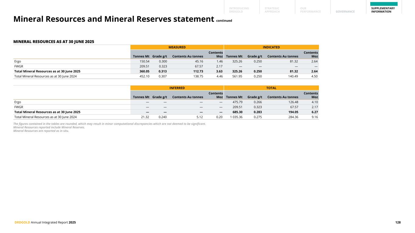 MINERAL RESOURCES AS AT 30 JUNE 2025 MEASURED INDICATED Tonnes Mt Grade g/t Contents Au tonnes Contents Moz Tonnes Mt Grade g/t Contents Au tonnes Contents Moz Ergo 150.54 0.300 45.16 1.46 325.26 0.250 81.32 2.64 FWGR 209.51 0.323 67.57 2.17 — — — — Total Mineral Resources as at 30 June 2025 360.05 0.313 112.73 3.63 325.26 0.250 81.32 2.64 Total Mineral Resources as at 30 June 2024 452.10 0.307 138.75 4.46 561.95 0.250 140.49 4.50 INFERRED TOTAL Tonnes Mt Grade g/t Contents Au tonnes Contents Moz Tonnes Mt Grade g/t Contents Au tonnes Contents Moz Ergo — — — — 475.79 0.266 126.48 4.10 FWGR — — — — 209.51 0.323 67.57 2.17 Total Mineral Resources as at 30 June 2025 — — — — 685.30 0.283 194.05 6.27 Total Mineral Resources as at 30 June 2024 21.32 0.240 5.12 0.20 1 035.36 0.275 284.36 9.16 The figures contained in the tables are rounded, which may result in minor computational discrepancies which are not deemed to be significant. Mineral Resources reported include Mineral Reserves. Mineral Resources are reported as in situ. INTRODUCING DRDGOLD STRATEGIC APPROACH OUR PERFORMANCE GOVERNANCE SUPPLEMENTARY INFORMATION Mineral Resources and Mineral Reserves statement continued DRDGOLD Annual Integrated Report 2025 128