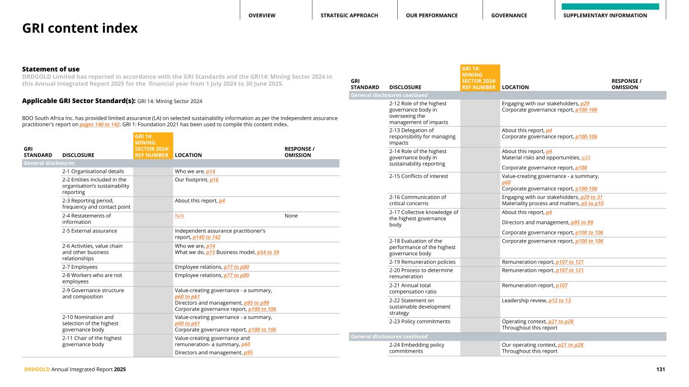 Statement of use DRDGOLD Limited has reported in accordance with the GRI Standards and the GRI14: Mining Sector 2024 in this Annual Integrated Report 2025 for the financial year from 1 July 2024 to 30 June 2025. Applicable GRI Sector Standard(s): GRI 14: Mining Sector 2024 BDO South Africa Inc. has provided limited assurance (LA) on selected sustainability information as per the Independent assurance practitioner's report on pages 140 to 142. GRI 1: Foundation 2021 has been used to compile this content index. GRI STANDARD DISCLOSURE GRI 14: MINING SECTOR 2024: REF NUMBER LOCATION RESPONSE / OMISSION General disclosures 2-1 Organisational details Who we are, p14 2-2 Entities included in the organisation’s sustainability reporting Our footprint, p16 2-3 Reporting period, frequency and contact point About this report, p4 2-4 Restatements of information N/A None 2-5 External assurance Independent assurance practitioner's report, p140 to 142 2-6 Activities, value chain and other business relationships Who we are, p14 What we do, p15 Business model, p54 to 59 2-7 Employees Employee relations, p77 to p80 2-8 Workers who are not employees Employee relations, p77 to p80 2-9 Governance structure and composition Value-creating governance - a summary, p60 to p61 Directors and management, p95 to p99 Corporate governance report, p100 to 106 2-10 Nomination and selection of the highest governance body Value-creating governance - a summary, p60 to p61 Corporate governance report, p100 to 106 2-11 Chair of the highest governance body Value-creating governance and remuneration- a summary, p60 Directors and management, p95 General disclosures continued GRI STANDARD DISCLOSURE GRI 14: MINING SECTOR 2024: REF NUMBER LOCATION RESPONSE / OMISSION 2-12 Role of the highest governance body in overseeing the management of impacts Engaging with our stakeholders, p29 Corporate governance report, p100-106 2-13 Delegation of responsibility for managing impacts About this report, p4 Corporate governance report, p100-106 2-14 Role of the highest governance body in sustainability reporting About this report, p4 Material risks and opportunities, p33 Corporate governance report, p100 2-15 Conflicts of interest Value-creating governance - a summary, p60 Corporate governance report, p100-106 2-16 Communication of critical concerns Engaging with our stakeholders, p29 to 31 Materiality process and matters, p5 to p10 2-17 Collective knowledge of the highest governance body About this report, p4 Directors and management, p95 to 99 Corporate governance report, p100 to 106 2-18 Evaluation of the performance of the highest governance body Corporate governance report, p100 to 106 2-19 Remuneration policies Remuneration report, p107 to 121 2-20 Process to determine remuneration Remuneration report, p107 to 121 2-21 Annual total compensation ratio Remuneration report, p107 2-22 Statement on sustainable development strategy Leadership review, p12 to 13 2-23 Policy commitments Operating context, p21 to p28 Throughout this report General disclosures continued 2-24 Embedding policy commitments Our operating context, p21 to p28 Throughout this report OVERVIEW STRATEGIC APPROACH OUR PERFORMANCE GOVERNANCE SUPPLEMENTARY INFORMATION GRI content index DRDGOLD Annual Integrated Report 2025 131