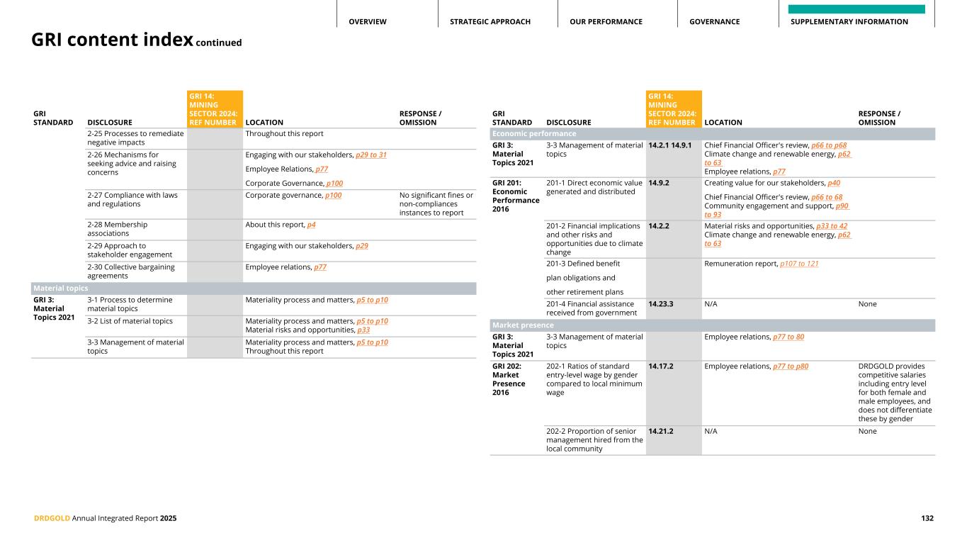 GRI STANDARD DISCLOSURE GRI 14: MINING SECTOR 2024: REF NUMBER LOCATION RESPONSE / OMISSION 2-25 Processes to remediate negative impacts Throughout this report 2-26 Mechanisms for seeking advice and raising concerns Engaging with our stakeholders, p29 to 31 Employee Relations, p77 Corporate Governance, p100 2-27 Compliance with laws and regulations Corporate governance, p100 No significant fines or non-compliances instances to report 2-28 Membership associations About this report, p4 2-29 Approach to stakeholder engagement Engaging with our stakeholders, p29 2-30 Collective bargaining agreements Employee relations, p77 Material topics GRI 3: Material Topics 2021 3-1 Process to determine material topics Materiality process and matters, p5 to p10 3-2 List of material topics Materiality process and matters, p5 to p10 Material risks and opportunities, p33 3-3 Management of material topics Materiality process and matters, p5 to p10 Throughout this report GRI STANDARD DISCLOSURE GRI 14: MINING SECTOR 2024: REF NUMBER LOCATION RESPONSE / OMISSION Economic performance GRI 3: Material Topics 2021 3-3 Management of material topics 14.2.1 14.9.1 Chief Financial Officer's review, p66 to p68 Climate change and renewable energy, p62 to 63 Employee relations, p77 GRI 201: Economic Performance 2016 201-1 Direct economic value generated and distributed 14.9.2 Creating value for our stakeholders, p40 Chief Financial Officer's review, p66 to 68 Community engagement and support, p90 to 93 201-2 Financial implications and other risks and opportunities due to climate change 14.2.2 Material risks and opportunities, p33 to 42 Climate change and renewable energy, p62 to 63 201-3 Defined benefit plan obligations and other retirement plans Remuneration report, p107 to 121 201-4 Financial assistance received from government 14.23.3 N/A None Market presence GRI 3: Material Topics 2021 3-3 Management of material topics Employee relations, p77 to 80 GRI 202: Market Presence 2016 202-1 Ratios of standard entry-level wage by gender compared to local minimum wage 14.17.2 Employee relations, p77 to p80 DRDGOLD provides competitive salaries including entry level for both female and male employees, and does not differentiate these by gender 202-2 Proportion of senior management hired from the local community 14.21.2 N/A None OVERVIEW STRATEGIC APPROACH OUR PERFORMANCE GOVERNANCE SUPPLEMENTARY INFORMATION GRI content index continued DRDGOLD Annual Integrated Report 2025 132
