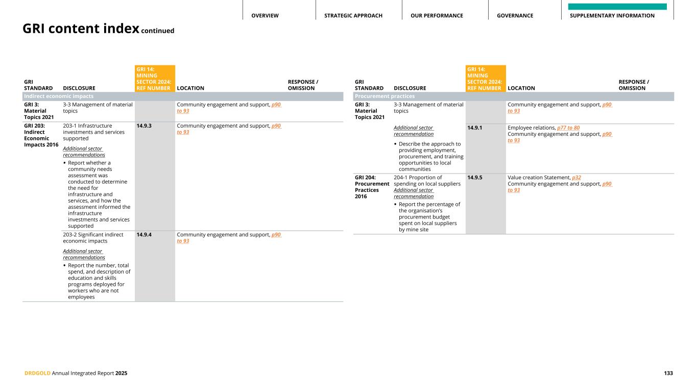 GRI STANDARD DISCLOSURE GRI 14: MINING SECTOR 2024: REF NUMBER LOCATION RESPONSE / OMISSION Indirect economic impacts GRI 3: Material Topics 2021 3-3 Management of material topics Community engagement and support, p90 to 93 GRI 203: Indirect Economic Impacts 2016 203-1 Infrastructure investments and services supported Additional sector recommendations • Report whether a community needs assessment was conducted to determine the need for infrastructure and services, and how the assessment informed the infrastructure investments and services supported 14.9.3 Community engagement and support, p90 to 93 203-2 Significant indirect economic impacts Additional sector recommendations • Report the number, total spend, and description of education and skills programs deployed for workers who are not employees 14.9.4 Community engagement and support, p90 to 93 GRI STANDARD DISCLOSURE GRI 14: MINING SECTOR 2024: REF NUMBER LOCATION RESPONSE / OMISSION Procurement practices GRI 3: Material Topics 2021 3-3 Management of material topics Community engagement and support, p90 to 93 Additional sector recommendation • Describe the approach to providing employment, procurement, and training opportunities to local communities 14.9.1 Employee relations, p77 to 80 Community engagement and support, p90 to 93 GRI 204: Procurement Practices 2016 204-1 Proportion of spending on local suppliers Additional sector recommendation • Report the percentage of the organisation’s procurement budget spent on local suppliers by mine site 14.9.5 Value creation Statement, p32 Community engagement and support, p90 to 93 OVERVIEW STRATEGIC APPROACH OUR PERFORMANCE GOVERNANCE SUPPLEMENTARY INFORMATION GRI content index continued DRDGOLD Annual Integrated Report 2025 133