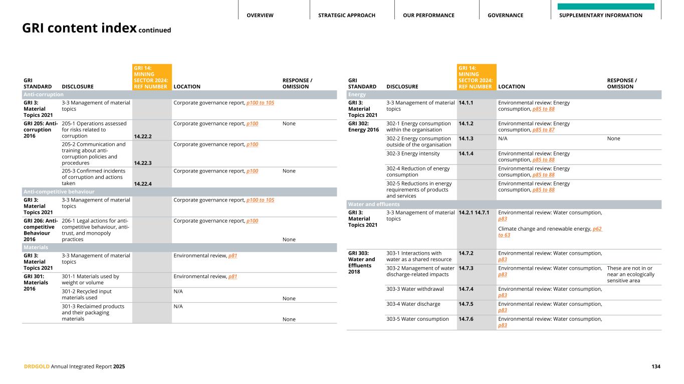 GRI STANDARD DISCLOSURE GRI 14: MINING SECTOR 2024: REF NUMBER LOCATION RESPONSE / OMISSION Anti-corruption GRI 3: Material Topics 2021 3-3 Management of material topics Corporate governance report, p100 to 105 GRI 205: Anti- corruption 2016 205-1 Operations assessed for risks related to corruption 14.22.2 Corporate governance report, p100 None 205-2 Communication and training about anti- corruption policies and procedures 14.22.3 Corporate governance report, p100 205-3 Confirmed incidents of corruption and actions taken 14.22.4 Corporate governance report, p100 None Anti-competitive behaviour GRI 3: Material Topics 2021 3-3 Management of material topics Corporate governance report, p100 to 105 GRI 206: Anti- competitive Behaviour 2016 206-1 Legal actions for anti- competitive behaviour, anti- trust, and monopoly practices Corporate governance report, p100 None Materials GRI 3: Material Topics 2021 3-3 Management of material topics Environmental review, p81 GRI 301: Materials 2016 301-1 Materials used by weight or volume Environmental review, p81 301-2 Recycled input materials used N/A None 301-3 Reclaimed products and their packaging materials N/A None GRI STANDARD DISCLOSURE GRI 14: MINING SECTOR 2024: REF NUMBER LOCATION RESPONSE / OMISSION Energy GRI 3: Material Topics 2021 3-3 Management of material topics 14.1.1 Environmental review: Energy consumption, p85 to 88 GRI 302: Energy 2016 302-1 Energy consumption within the organisation 14.1.2 Environmental review: Energy consumption, p85 to 87 302-2 Energy consumption outside of the organisation 14.1.3 N/A None 302-3 Energy intensity 14.1.4 Environmental review: Energy consumption, p85 to 88 302-4 Reduction of energy consumption Environmental review: Energy consumption, p85 to 88 302-5 Reductions in energy requirements of products and services Environmental review: Energy consumption, p85 to 88 Water and effluents GRI 3: Material Topics 2021 3-3 Management of material topics 14.2.1 14.7.1 Environmental review: Water consumption, p83 Climate change and renewable energy, p62 to 63 GRI 303: Water and Effluents 2018 303-1 Interactions with water as a shared resource 14.7.2 Environmental review: Water consumption, p83 303-2 Management of water discharge-related impacts 14.7.3 Environmental review: Water consumption, p83 These are not in or near an ecologically sensitive area 303-3 Water withdrawal 14.7.4 Environmental review: Water consumption, p83 303-4 Water discharge 14.7.5 Environmental review: Water consumption, p83 303-5 Water consumption 14.7.6 Environmental review: Water consumption, p83 OVERVIEW STRATEGIC APPROACH OUR PERFORMANCE GOVERNANCE SUPPLEMENTARY INFORMATION GRI content index continued DRDGOLD Annual Integrated Report 2025 134