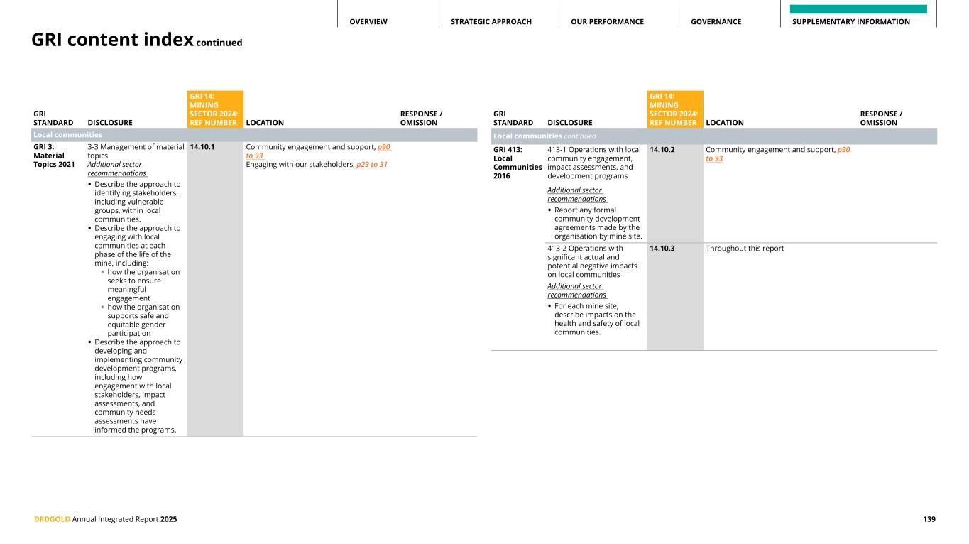 GRI STANDARD DISCLOSURE GRI 14: MINING SECTOR 2024: REF NUMBER LOCATION RESPONSE / OMISSION Local communities GRI 3: Material Topics 2021 3-3 Management of material topics Additional sector recommendations • Describe the approach to identifying stakeholders, including vulnerable groups, within local communities. • Describe the approach to engaging with local communities at each phase of the life of the mine, including: • how the organisation seeks to ensure meaningful engagement • how the organisation supports safe and equitable gender participation • Describe the approach to developing and implementing community development programs, including how engagement with local stakeholders, impact assessments, and community needs assessments have informed the programs. 14.10.1 Community engagement and support, p90 to 93 Engaging with our stakeholders, p29 to 31 GRI STANDARD DISCLOSURE GRI 14: MINING SECTOR 2024: REF NUMBER LOCATION RESPONSE / OMISSION Local communities continued GRI 413: Local Communities 2016 413-1 Operations with local community engagement, impact assessments, and development programs Additional sector recommendations • Report any formal community development agreements made by the organisation by mine site. 14.10.2 Community engagement and support, p90 to 93 413-2 Operations with significant actual and potential negative impacts on local communities Additional sector recommendations • For each mine site, describe impacts on the health and safety of local communities. 14.10.3 Throughout this report OVERVIEW STRATEGIC APPROACH OUR PERFORMANCE GOVERNANCE SUPPLEMENTARY INFORMATION GRI content index continued DRDGOLD Annual Integrated Report 2025 139