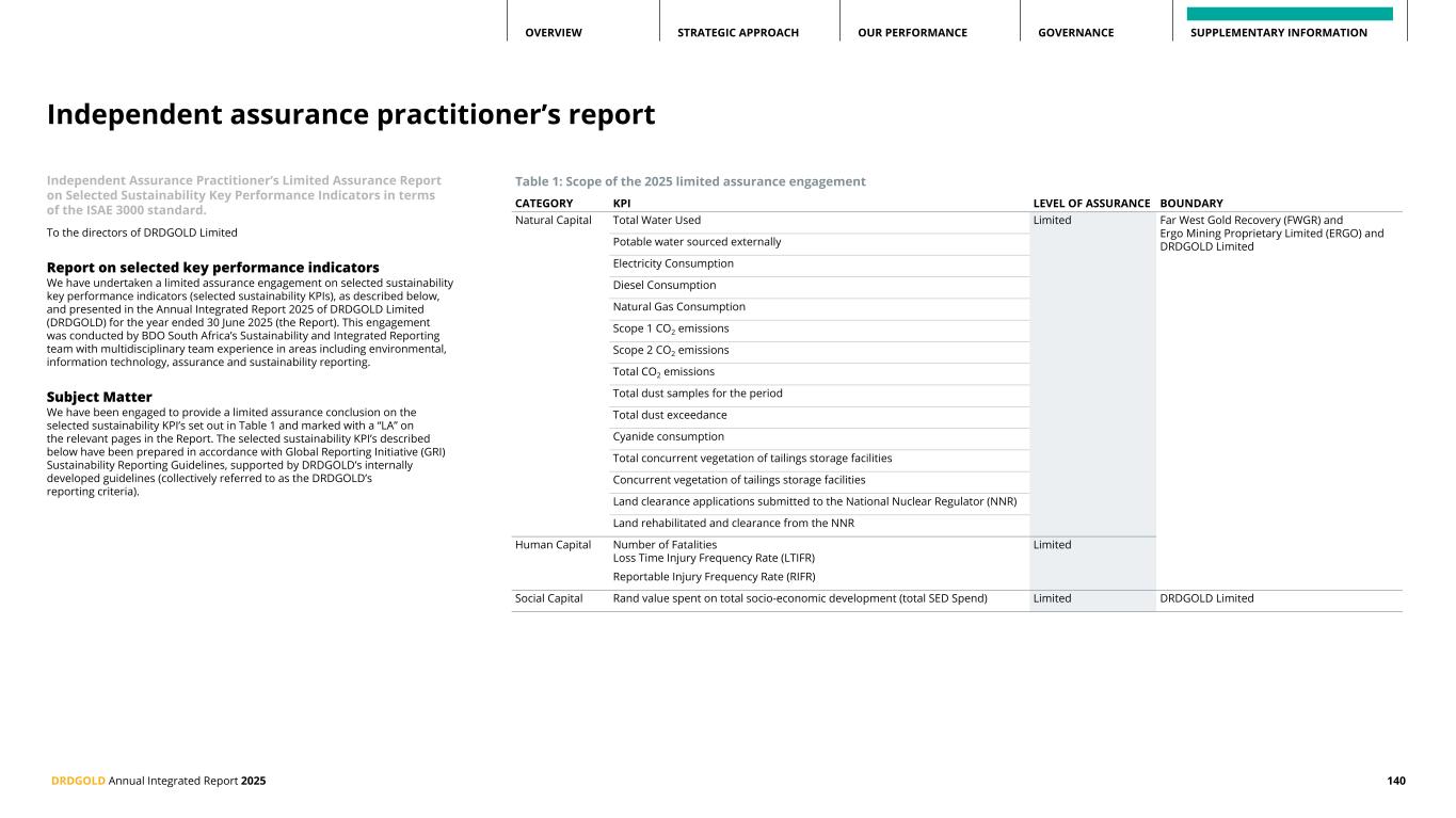 Independent Assurance Practitioner’s Limited Assurance Report on Selected Sustainability Key Performance Indicators in terms of the ISAE 3000 standard. To the directors of DRDGOLD Limited Report on selected key performance indicators We have undertaken a limited assurance engagement on selected sustainability key performance indicators (selected sustainability KPIs), as described below, and presented in the Annual Integrated Report 2025 of DRDGOLD Limited (DRDGOLD) for the year ended 30 June 2025 (the Report). This engagement was conducted by BDO South Africa’s Sustainability and Integrated Reporting team with multidisciplinary team experience in areas including environmental, information technology, assurance and sustainability reporting. Subject Matter We have been engaged to provide a limited assurance conclusion on the selected sustainability KPI’s set out in Table 1 and marked with a “LA” on the relevant pages in the Report. The selected sustainability KPI’s described below have been prepared in accordance with Global Reporting Initiative (GRI) Sustainability Reporting Guidelines, supported by DRDGOLD’s internally developed guidelines (collectively referred to as the DRDGOLD’s reporting criteria). OVERVIEW STRATEGIC APPROACH OUR PERFORMANCE GOVERNANCE SUPPLEMENTARY INFORMATION Independent assurance practitioner’s report DRDGOLD Annual Integrated Report 2025 140 Table 1: Scope of the 2025 limited assurance engagement CATEGORY KPI LEVEL OF ASSURANCE BOUNDARY Natural Capital Total Water Used Limited Far West Gold Recovery (FWGR) and Ergo Mining Proprietary Limited (ERGO) and DRDGOLD LimitedPotable water sourced externally Electricity Consumption Diesel Consumption Natural Gas Consumption Scope 1 CO2 emissions Scope 2 CO2 emissions Total CO2 emissions Total dust samples for the period Total dust exceedance Cyanide consumption Total concurrent vegetation of tailings storage facilities Concurrent vegetation of tailings storage facilities Land clearance applications submitted to the National Nuclear Regulator (NNR) Land rehabilitated and clearance from the NNR Human Capital Number of Fatalities Loss Time Injury Frequency Rate (LTIFR) Limited Reportable Injury Frequency Rate (RIFR) Social Capital Rand value spent on total socio-economic development (total SED Spend) Limited DRDGOLD Limited