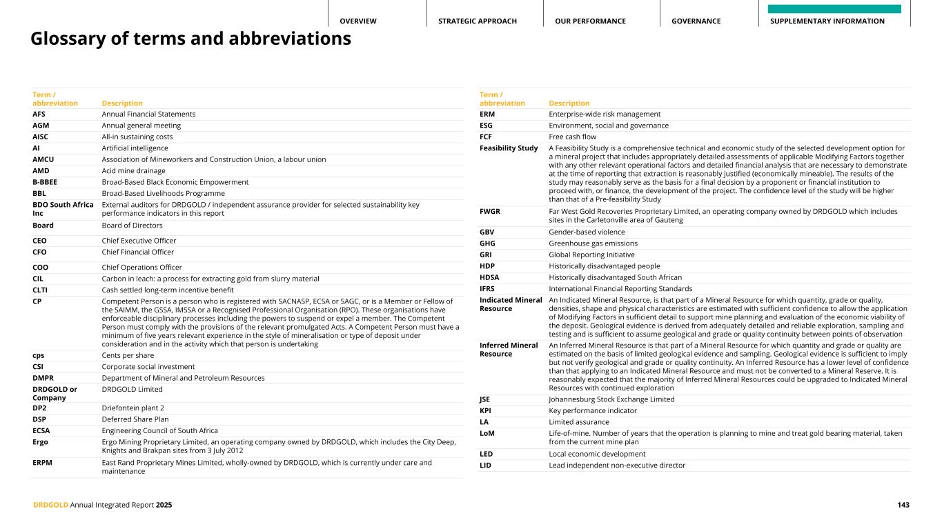 Description AFS Annual Financial Statements AGM Annual general meeting AISC All-in sustaining costs AI Artificial intelligence AMCU Association of Mineworkers and Construction Union, a labour union AMD Acid mine drainage B-BBEE Broad-Based Black Economic Empowerment BBL Broad-Based Livelihoods Programme BDO South Africa Inc External auditors for DRDGOLD / independent assurance provider for selected sustainability key performance indicators in this report Board Board of Directors CEO Chief Executive Officer CFO Chief Financial Officer COO Chief Operations Officer CIL Carbon in leach: a process for extracting gold from slurry material CLTI Cash settled long-term incentive benefit CP Competent Person is a person who is registered with SACNASP, ECSA or SAGC, or is a Member or Fellow of the SAIMM, the GSSA, IMSSA or a Recognised Professional Organisation (RPO). These organisations have enforceable disciplinary processes including the powers to suspend or expel a member. The Competent Person must comply with the provisions of the relevant promulgated Acts. A Competent Person must have a minimum of five years relevant experience in the style of mineralisation or type of deposit under consideration and in the activity which that person is undertaking cps Cents per share CSI Corporate social investment DMPR Department of Mineral and Petroleum Resources DRDGOLD or Company DRDGOLD Limited DP2 Driefontein plant 2 DSP Deferred Share Plan ECSA Engineering Council of South Africa Ergo Ergo Mining Proprietary Limited, an operating company owned by DRDGOLD, which includes the City Deep, Knights and Brakpan sites from 3 July 2012 ERPM East Rand Proprietary Mines Limited, wholly-owned by DRDGOLD, which is currently under care and maintenance Term / abbreviation Description ERM Enterprise-wide risk management ESG Environment, social and governance FCF Free cash flow Feasibility Study A Feasibility Study is a comprehensive technical and economic study of the selected development option for a mineral project that includes appropriately detailed assessments of applicable Modifying Factors together with any other relevant operational factors and detailed financial analysis that are necessary to demonstrate at the time of reporting that extraction is reasonably justified (economically mineable). The results of the study may reasonably serve as the basis for a final decision by a proponent or financial institution to proceed with, or finance, the development of the project. The confidence level of the study will be higher than that of a Pre-feasibility Study FWGR Far West Gold Recoveries Proprietary Limited, an operating company owned by DRDGOLD which includes sites in the Carletonville area of Gauteng GBV Gender-based violence GHG Greenhouse gas emissions GRI Global Reporting Initiative HDP Historically disadvantaged people HDSA Historically disadvantaged South African IFRS International Financial Reporting Standards Indicated Mineral Resource An Indicated Mineral Resource, is that part of a Mineral Resource for which quantity, grade or quality, densities, shape and physical characteristics are estimated with sufficient confidence to allow the application of Modifying Factors in sufficient detail to support mine planning and evaluation of the economic viability of the deposit. Geological evidence is derived from adequately detailed and reliable exploration, sampling and testing and is sufficient to assume geological and grade or quality continuity between points of observation Inferred Mineral Resource An Inferred Mineral Resource is that part of a Mineral Resource for which quantity and grade or quality are estimated on the basis of limited geological evidence and sampling. Geological evidence is sufficient to imply but not verify geological and grade or quality continuity. An Inferred Resource has a lower level of confidence than that applying to an Indicated Mineral Resource and must not be converted to a Mineral Reserve. It is reasonably expected that the majority of Inferred Mineral Resources could be upgraded to Indicated Mineral Resources with continued exploration JSE Johannesburg Stock Exchange Limited KPI Key performance indicator LA Limited assurance LoM Life-of-mine. Number of years that the operation is planning to mine and treat gold bearing material, taken from the current mine plan LED Local economic development LID Lead independent non-executive director Term / abbreviation OVERVIEW STRATEGIC APPROACH OUR PERFORMANCE GOVERNANCE SUPPLEMENTARY INFORMATION Glossary of terms and abbreviations DRDGOLD Annual Integrated Report 2025 143