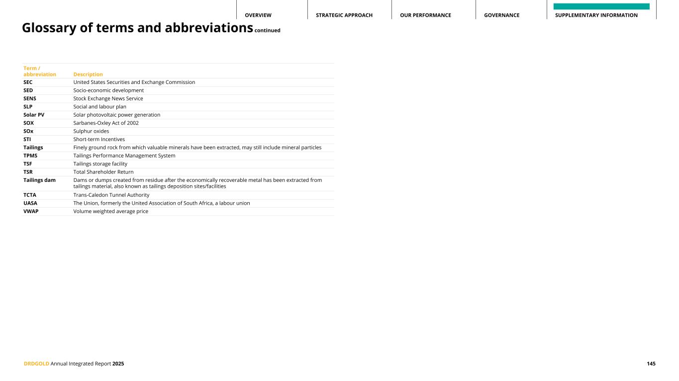 Description SEC United States Securities and Exchange Commission SED Socio-economic development SENS Stock Exchange News Service SLP Social and labour plan Solar PV Solar photovoltaic power generation SOX Sarbanes-Oxley Act of 2002 SOx Sulphur oxides STI Short-term Incentives Tailings Finely ground rock from which valuable minerals have been extracted, may still include mineral particles TPMS Tailings Performance Management System TSF Tailings storage facility TSR Total Shareholder Return Tailings dam Dams or dumps created from residue after the economically recoverable metal has been extracted from tailings material, also known as tailings deposition sites/facilities TCTA Trans-Caledon Tunnel Authority UASA The Union, formerly the United Association of South Africa, a labour union VWAP Volume weighted average price Term / abbreviation OVERVIEW STRATEGIC APPROACH OUR PERFORMANCE GOVERNANCE SUPPLEMENTARY INFORMATION Glossary of terms and abbreviations continued DRDGOLD Annual Integrated Report 2025 145