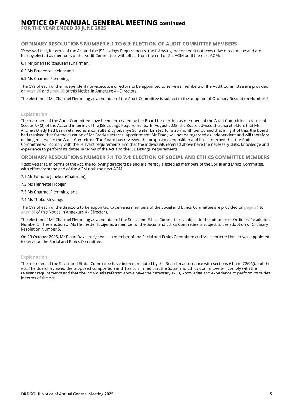 ORDINARY RESOLUTIONS NUMBER 6.1 TO 6.3: ELECTION OF AUDIT COMMITTEE MEMBERS “Resolved that, in terms of the Act and the JSE Listings Requirements, the following independent non-executive directors be and are hereby elected as members of the Audit Committee, with effect from the end of the AGM until the next AGM: 6.1 Mr Johan Holtzhausen (Chairman); 6.2 Ms Prudence Lebina; and 6.3 Ms Charmel Flemming The CVs of each of the independent non-executive directors to be appointed to serve as members of the Audit Committee are provided on page 26 and page 28 of this Notice in Annexure 4 - Directors. The election of Ms Charmel Flemming as a member of the Audit Committee is subject to the adoption of Ordinary Resolution Number 3. Explanation The members of the Audit Committee have been nominated by the Board for election as members of the Audit Committee in terms of Section 94(2) of the Act and in terms of the JSE Listings Requirements. In August 2025, the Board advised the shareholders that Mr Andrew Brady had been retained as a consultant by Sibanye Stillwater Limited for a six month period and that in light of this, the Board had resolved that for the duration of Mr Brady's external appointment, Mr Brady will not be regarded as independent and will therefore no longer serve on the Audit Committee. The Board has reviewed the proposed composition and has confirmed that the Audit Committee will comply with the relevant requirements and that the individuals referred above have the necessary skills, knowledge and experience to perform its duties in terms of the Act and the JSE Listings Requirements. ORDINARY RESOLUTIONS NUMBER 7.1 TO 7.4: ELECTION OF SOCIAL AND ETHICS COMMITTEE MEMBERS “Resolved that, in terms of the Act, the following directors be and are hereby elected as members of the Social and Ethics Committee, with effect from the end of the AGM until the next AGM: 7.1 Mr Edmund Jeneker (Chairman); 7.2 Ms Henriette Hooijer 7.3 Ms Charmel Flemming; and 7.4 Ms Thoko Mnyango The CVs of each of the directors to be appointed to serve as members of the Social and Ethics Committee are provided on page 26 to page 28 of this Notice in Annexure 4 - Directors. The election of Ms Charmel Flemming as a member of the Social and Ethics Committee is subject to the adoption of Ordinary Resolution Number 3. The election of Ms Henriette Hooijer as a member of the Social and Ethics Committee is subject to the adoption of Ordinary Resolution Number 5. On 23 October 2025, Mr Riaan Davel resigned as a member of the Social and Ethics Committee and Ms Henriette Hooijer was appointed to serve on the Social and Ethics Committee. Explanation The members of the Social and Ethics Committee have been nominated by the Board in accordance with sections 61 and 72(9A)(a) of the Act. The Board reviewed the proposed composition and has confirmed that the Social and Ethics Committee will comply with the relevant requirements and that the individuals referred above have the necessary skills, knowledge and experience to perform its duties in terms of the Act. NOTICE OF ANNUAL GENERAL MEETING continued FOR THE YEAR ENDED 30 JUNE 2025 DRDGOLD Notice of Annual General Meeting 2025 5