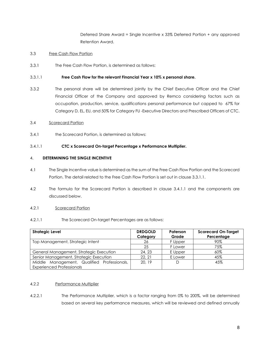 8 Deferred Share Award = Single Incentive x 33% Deferred Portion + any approved Retention Award. Free Cash Flow Portion The Free Cash Flow Portion, is determined as follows: 3.3.1.1 Free Cash Flow for the relevant Financial Year x 10% x personal share. The personal share will be determined jointly by the Chief Executive Officer and the Chief Financial Officer of the Company and approved by Remco considering factors such as occupation, production, service, qualifications personal performance but capped to 67% for Category D, EL, EU, and 50% for Category FU -Executive Directors and Prescribed Officers of CTC. Scorecard Portion the Scorecard Portion, is determined as follows: 3.4.1.1 CTC x Scorecard On-target Percentage x Performance Multiplier. 4. DETERMINING THE SINGLE INCENTIVE The Single Incentive value is determined as the sum of the Free Cash Flow Portion and the Scorecard Portion. The detail related to the Free Cash Flow Portion is set out in clause 3.3.1.1. The formula for the Scorecard Portion is described in clause 3.4.1.1 and the components are discussed below. Scorecard Portion 4.2.1.1 The Scorecard On-target Percentages are as follows: Strategic Level DRDGOLD Category Paterson Grade Scorecard On-Target Percentage Top Management, Strategic Intent 26 F Upper 90% 25 F Lower 75% General Management, Strategic Execution 24, 23 E Upper 60% Senior Management, Strategic Execution 22, 21 E Lower 45% Middle Management, Qualified Professionals, Experienced Professionals 20, 19 D 45% Performance Multiplier 4.2.2.1 The Performance Multiplier, which is a factor ranging from 0% to 200%, will be determined based on several key performance measures, which will be reviewed and defined annually