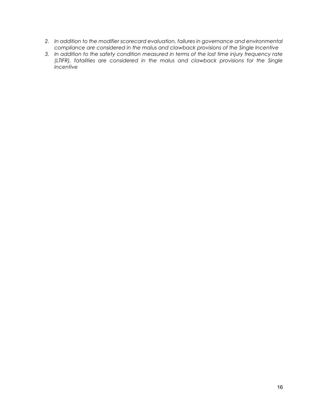 16 2. In addition to the modifier scorecard evaluation, failures in governance and environmental compliance are considered in the malus and clawback provisions of the Single Incentive 3. In addition to the safety condition measured in terms of the lost time injury frequency rate (LTIFR), fatalities are considered in the malus and clawback provisions for the Single Incentive