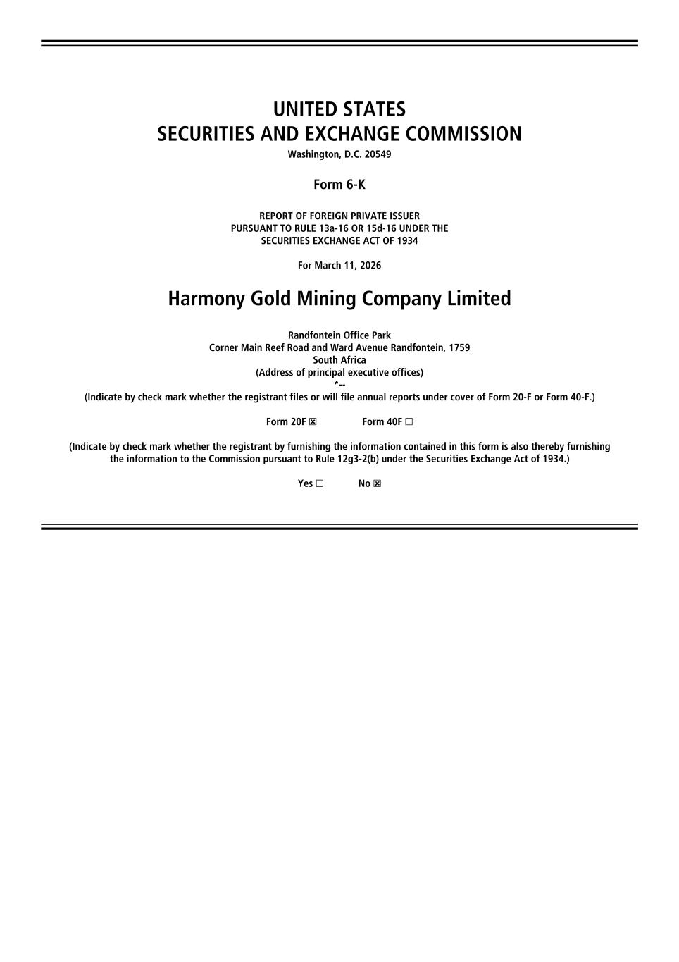UNITED STATES SECURITIES AND EXCHANGE COMMISSION Washington, D.C. 20549 Form 6K REPORT OF FOREIGN PRIVATE ISSUER PURSUANT TO RULE 13a16 OR 15d16 UNDER THE SECURITIES EXCHANGE ACT OF 1934 For March 11, 2026 Harmony Gold Mining Company Limited Randfontein Office Park Corner Main Reef Road and Ward Avenue Randfontein, 1759 South Africa (Address of principal executive offices) *- (Indicate by check mark whether the registrant files or will file annual reports under cover of Form 20F or Form 40F.) Form 20F ☒ Form 40F ☐ (Indicate by check mark whether the registrant by furnishing the information contained in this form is also thereby furnishing the information to the Commission pursuant to Rule 12g32(b) under the Securities Exchange Act of 1934.) Yes ☐ No ☒