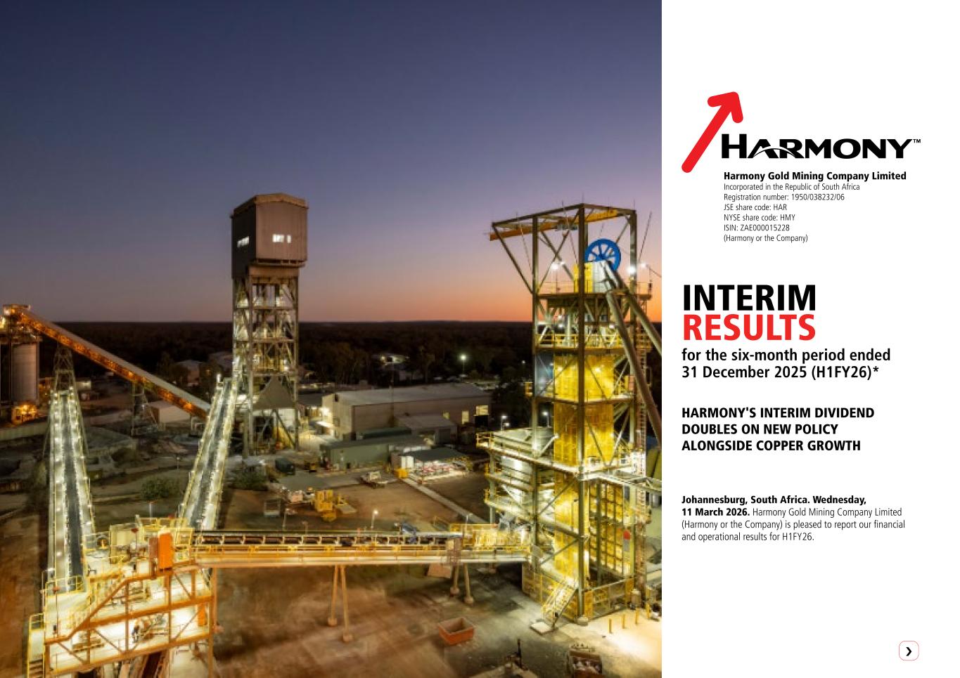 INTERIM RESULTS for the six-month period ended 31 December 2025 (H1FY26)* Harmony Gold Mining Company Limited Incorporated in the Republic of South Africa Registration number: 1950/038232/06 JSE share code: HAR NYSE share code: HMY ISIN: ZAE000015228 (Harmony or the Company) HARMONY'S INTERIM DIVIDEND DOUBLES ON NEW POLICY ALONGSIDE COPPER GROWTH Johannesburg, South Africa. Wednesday, 11 March 2026. Harmony Gold Mining Company Limited (Harmony or the Company) is pleased to report our financial and operational results for H1FY26. ›