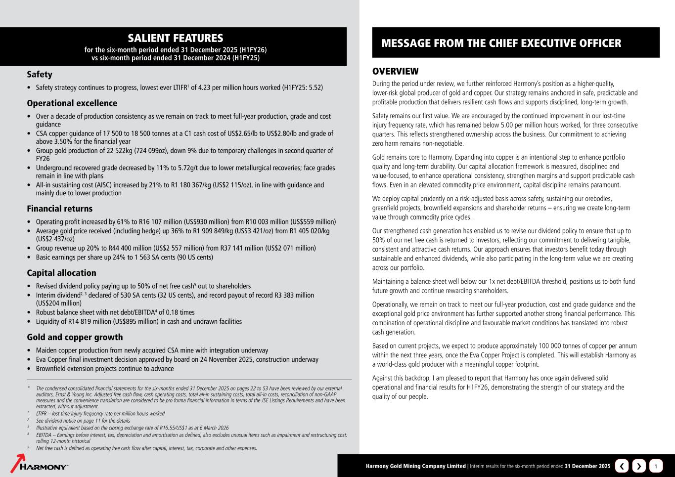 MESSAGE FROM THE CHIEF EXECUTIVE OFFICER continued Harmony Gold Mining Company Limited | Interim results for the six-month period ended 31 December 2025 2 RESPONSIBLE STEWARDSHIP Safety: Proactive strategy continues to deliver improvements Nothing matters more than ensuring every person returns home safely, every day. Our people are our most important assets and we remain unwavering in our commitment to zero loss of life. Tragically we lost one colleague in the second quarter of the financial year. We remember and honour the life of Mr Markus Bekker, electrician at Mponeng, 26 October 2025 (Q2FY26). Through our Thibakotsi’s humanistic culture transformation we are embedding personal ownership across the organisation. This is supported by our Accountability Model, Risk Response Protocol and disciplined learning from incidents. Our proactive focus on leading indicators, continues to drive quarter‑on‑quarter progress across our key safety measures. Performance and scorecard remuneration has been amended and is now linked to both leading and lagging indicators. Leading indicators include Workplace Hazard Ratings and Loss-of-life Critical Control Checks while lagging indicators include LTIFR. This year we made progress, delivering a loss-of-life free first quarter and all major indicators improving year on year – evidence of the discipline, consistency and accountability across the organisation. Our safety non‑negotiables are clear and constant: golden control compliance, effective management and supervisory routines, and life‑saving behaviours – everywhere, every shift. This is how we deliver safe, predictable production and live our pillar of Responsible Stewardship until zero harm is a reality for every person at Harmony. Indicator per million hours worked H1FY26 H1FY25 LTIFR1 4.23 5.52 RIFR2 2.82 3.38 LLIFR3 0.02 0.02 1. Lost time injury frequency rate 2. Reportable injury frequency rate 3. Loss of life injury frequency rate Embedded sustainability Sustainability is embedded in how we run the business and is integral to holistic risk management. We are advancing our science‑based pathway to net‑zero by 2045, with the 100 MW Moab Khotsong PV plant scheduled to begin phased commissioning in April 2026. This progress is supported by a growing pipeline of renewable‑energy initiatives that strengthen operational resilience by reducing emissions exposure and mitigating power‑price volatility. Harmony’s 2025 CDP results highlight our leadership in water stewardship, earning a Leadership score of A- in Water Security and a Management score of B in Climate Change, both improved from prior years. The 2025 CDP scores further reflect a mature, well-governed and transparent approach to environmental management, further demonstrating our commitment to sustainability, while also positioning the company as a benchmark for responsible mining within the gold sector. Our community programmes will continue to grow alongside our rehabilitation and environmental stewardship work. This integrated approach of combining climate action, operational discipline and meaningful social investment, ensures we remain responsible custodians of the assets and communities entrusted to us, while building a more resilient, competitive and future‑focused Harmony. CAPITAL ALLOCATION ANCHORED IN DISCIPLINED, LONG‑TERM VALUE CREATION Revised dividend policy returns more of our net free cash* to shareholders After careful consideration of our capital requirements, capital structure, through-the-cycle macroeconomic conditions and current strong cash flow generation, we are pleased to announce that we have revised our dividend policy to provide shareholders with enhanced upside participation. Harmony has amended its dividend policy to allow for up to 50% of net free cash* to be returned to shareholders, subject to the discretion of the board and net debt to EBITDA (leverage) levels. The revised policy now includes an improved base dividend, which has been increased from 20% to 30% of net free cash*. In addition, an upside dividend may be paid, based on leverage levels. When leverage is equal to or above 0.5x and below 1x, only a base dividend of 30% of net free cash* is payable. As leverage improves, the board may at its sole discretion consider an upside dividend of up to 20% of net free cash*. In-line with our new dividend policy, we are pleased to announce an interim dividend of 530 SA cents (32 US cents**) per share for this reporting period, resulting in a rolling 12-month dividend yield of 2.2% based off the closing JSE share price of R318.11 on 6 March 2026. It also represents a total payout of 43% of net cash*. The total dividend payout for this reporting period is a record R3 383 million (US$204 million). * Net free cash is defined as operating free cash flow after capital, interest, tax, corporate and other expenses. ** The dividend was converted using a closing exchange rate of R16.55/US$1 at 6 March 2026. Balance sheet strength and flexibility maintained We have maintained a healthy balance sheet which is in a net debt position of R5 544 million (US$335 million) after the acquisition of MAC Copper. EBITDA for the reporting period increased by 39% to R18 004 million (US$1 037 million) in H1FY26 from R12 924 million (US$721 million) in H1FY25. Our annualised net debt/EBITDA was 0.18 times as at 31 December 2025 and comfortably below the 1 times internal threshold. At current levels we expect to be back in a net cash position by the end of the financial year. We had R14 819 million (US$895 million) available in cash and undrawn facilities as at 31 December 2025. We are therefore well-positioned to continue funding all our operational needs alongside our various growth projects while paying a consistent and enhanced dividend. We are actively assessing our capital structure to maintain an efficient balance sheet that is appropriately matched to both our funding needs and the strength of our cash‑