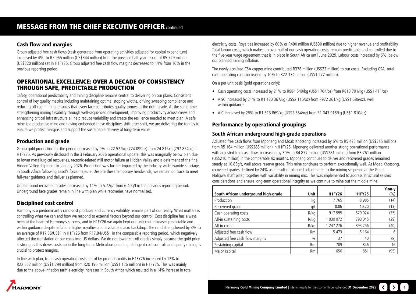 MESSAGE FROM THE CHIEF EXECUTIVE OFFICER continued Harmony Gold Mining Company Limited | Interim results for the six-month period ended 31 December 2025 4 Cash flow and margins Group adjusted free cash flows (cash generated from operating activities adjusted for capital expenditure) increased by 4%, to R5 965 million (US$344 million) from the previous half-year record of R5 729 million (US$320 million) set in H1FY25. Group adjusted free cash flow margins decreased to 14% from 16% in the previous reporting period. OPERATIONAL EXCELLENCE: OVER A DECADE OF CONSISTENCY THROUGH SAFE, PREDICTABLE PRODUCTION Safety, operational predictability and mining discipline remains central to delivering on our plans. Consistent control of key quality metrics including maintaining optimal stoping widths, driving sweeping compliance and reducing off‑reef mining ensures that every face contributes quality tonnes at the right grade. At the same time, strengthening mining flexibility through well‑sequenced development, improving productivity across crews and enhancing critical infrastructure all help reduce variability and create the resilience needed to meet plan. A safe mine is a productive mine and having embedded these disciplines shift after shift, we are delivering the tonnes to ensure we protect margins and support the sustainable delivery of long‑term value. Production and grade Group gold production for the period decreased by 9% to 22 522kg (724 099oz) from 24 816kg (797 854oz) in H1FY25. As previously disclosed in the 3 February 2026 operational update, this was marginally below plan due to lower metallurgical recoveries, tectonic-related mill motor failure at Hidden Valley and a deferment of the final Hidden Valley shipment to January 2026. Production was further impacted by the industry‑wide cyanide shortage in South Africa following Sasol’s force majeure. Despite these temporary headwinds, we remain on track to meet full‑year guidance and deliver as planned. Underground recovered grades decreased by 11% to 5.72g/t from 6.40g/t in the previous reporting period. Underground face grades remain in line with plan while recoveries have normalised. Disciplined cost control Harmony is a predominantly rand-cost producer and currency volatility remains part of our reality. What matters is controlling what we can and how we respond to external factors beyond our control. Cost discipline has always been at the heart of Harmony’s success, and in H1FY26 we again kept our unit cost increases predictable and within guidance despite inflation, higher royalties and a volatile macro backdrop. The rand strengthened by 3% to an average of R17.36/US$1 in H1FY26 from R17.94/US$1 in the comparable reporting period, which negatively affected the translation of our costs into US dollars. We do not lower cut‑off grades simply because the gold price is strong as this drives costs up in the long term. Meticulous planning, stringent cost controls and quality mining is crucial to protect margins. In line with plan, total cash operating costs net of by-product credits in H1FY26 increased by 12% to R22 552 million (US$1 299 million) from R20 195 million (US$1 126 million) in H1FY25. This was mainly due to the above-inflation tariff electricity increases in South Africa which resulted in a 14% increase in total electricity costs. Royalties increased by 60% or R490 million (US$30 million) due to higher revenue and profitability. Total labour costs, which makes up over half of our cash operating costs, remain predictable and controlled due to the five-year wage agreement that is in place in South Africa until June 2029. Labour costs increased by 6%, below our planned mining inflation. The newly acquired CSA copper mine contributed R378 million (US$22 million) to our costs. Excluding CSA, total cash operating costs increased by 10% to R22 174 million (US$1 277 million). On a per unit basis (gold operations only): • Cash operating costs increased by 21% to R984 549/kg (US$1 764/oz) from R813 791/kg (US$1 411/oz) • AISC increased by 21% to R1 180 367/kg (US$2 115/oz) from R972 261/kg (US$1 686/oz), well within guidance • AIC increased by 26% to R1 313 869/kg (US$2 354/oz) from R1 043 918/kg (US$1 810/oz). Performance by operational groupings South African underground high-grade operations Adjusted free cash flows from Mponeng and Moab Khotsong increased by 6% to R5 473 million (US$315 million) from R5 164 million (US$288 million) in H1FY25. Mponeng delivered another strong operational performance with adjusted free cash flows increasing by 30% to R4 877 million (US$281 million) from R3 761 million (US$210 million) in the comparable six months. Mponeng continues to deliver and recovered grades remained steady at 10.85g/t, well above reserve grade. This mine continues to perform exceptionally well. At Moab Khotsong, recovered grades declined by 24% as a result of planned adjustments to the mining sequence at the Great Noligwa shaft pillar, together with variability in mining mix. This was implemented to address structural seismic considerations and ensure long-term operational integrity as we continue to mine out the middle mine. South African underground high-grade Unit H1FY26 H1FY25 Y-on-y (%) Production kg 7 765 8 985 (14) Recovered grade g/t 8.86 10.20 (13) Cash operating costs R/kg 917 595 679 024 (35) All-in sustaining costs R/kg 1 030 072 798 045 (29) All-in costs R/kg 1 247 276 893 256 (40) Adjusted free cash flow Rm 5 473 5 164 6 Adjusted free cash flow margins % 37 40 (8) Sustaining capital Rm 709 846 16 Major capital Rm 1 656 851 (95) ›‹