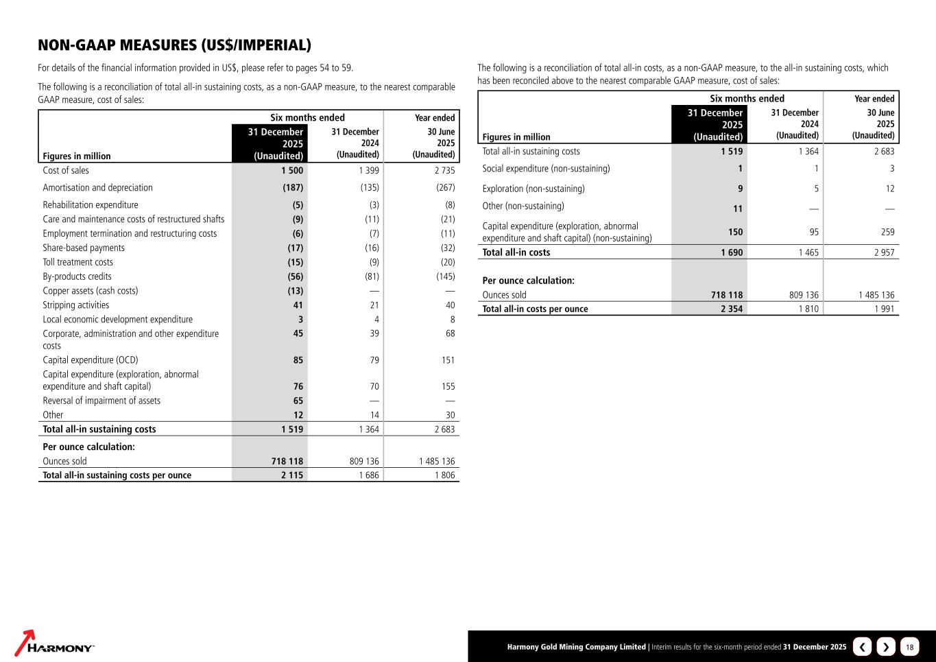 Harmony Gold Mining Company Limited | Interim results for the six-month period ended 31 December 2025 18 For details of the financial information provided in US$, please refer to pages 54 to 59. The following is a reconciliation of total all-in sustaining costs, as a non-GAAP measure, to the nearest comparable GAAP measure, cost of sales: Six months ended Year ended Figures in million 31 December 2025 (Unaudited) 31 December 2024 (Unaudited) 30 June 2025 (Unaudited) Cost of sales 1 500 1 399 2 735 Amortisation and depreciation (187) (135) (267) Rehabilitation expenditure (5) (3) (8) Care and maintenance costs of restructured shafts (9) (11) (21) Employment termination and restructuring costs (6) (7) (11) Share-based payments (17) (16) (32) Toll treatment costs (15) (9) (20) By-products credits (56) (81) (145) Copper assets (cash costs) (13) — — Stripping activities 41 21 40 Local economic development expenditure 3 4 8 Corporate, administration and other expenditure costs 45 39 68 Capital expenditure (OCD) 85 79 151 Capital expenditure (exploration, abnormal expenditure and shaft capital) 76 70 155 Reversal of impairment of assets 65 — — Other 12 14 30 Total all-in sustaining costs 1 519 1 364 2 683 Per ounce calculation: Ounces sold 718 118 809 136 1 485 136 Total all-in sustaining costs per ounce 2 115 1 686 1 806 The following is a reconciliation of total all-in costs, as a non-GAAP measure, to the all-in sustaining costs, which has been reconciled above to the nearest comparable GAAP measure, cost of sales: Six months ended Year ended Figures in million 31 December 2025 (Unaudited) 31 December 2024 (Unaudited) 30 June 2025 (Unaudited) Total all-in sustaining costs 1 519 1 364 2 683 Social expenditure (non-sustaining) 1 1 3 Exploration (non-sustaining) 9 5 12 Other (non-sustaining) 11 — — Capital expenditure (exploration, abnormal expenditure and shaft capital) (non-sustaining) 150 95 259 Total all-in costs 1 690 1 465 2 957 Per ounce calculation: Ounces sold 718 118 809 136 1 485 136 Total all-in costs per ounce 2 354 1 810 1 991 NON-GAAP MEASURES (US$/IMPERIAL) ›‹