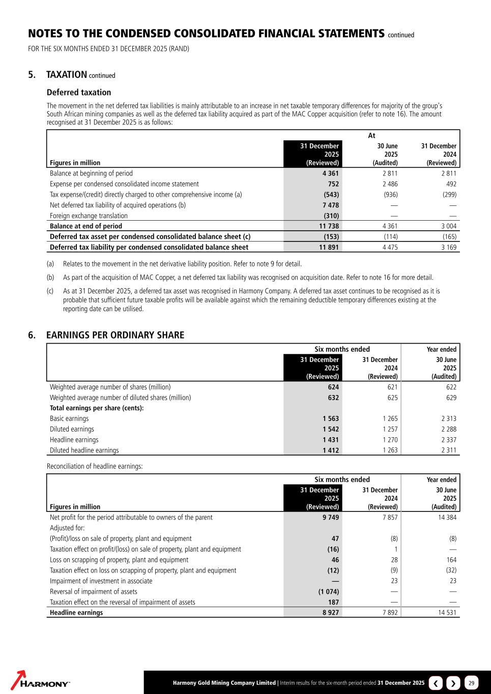 Harmony Gold Mining Company Limited | Interim results for the six-month period ended 31 December 2025 29 NOTES TO THE CONDENSED CONSOLIDATED FINANCIAL STATEMENTS continued FOR THE SIX MONTHS ENDED 31 DECEMBER 2025 (RAND) 5. TAXATION continued Deferred taxation The movement in the net deferred tax liabilities is mainly attributable to an increase in net taxable temporary differences for majority of the group's South African mining companies as well as the deferred tax liability acquired as part of the MAC Copper acquisition (refer to note 16). The amount recognised at 31 December 2025 is as follows: At Figures in million 31 December 2025 (Reviewed) 30 June 2025 (Audited) 31 December 2024 (Reviewed) Balance at beginning of period 4 361 2 811 2 811 Expense per condensed consolidated income statement 752 2 486 492 Tax expense/(credit) directly charged to other comprehensive income (a) (543) (936) (299) Net deferred tax liability of acquired operations (b) 7 478 — — Foreign exchange translation (310) — — Balance at end of period 11 738 4 361 3 004 Deferred tax asset per condensed consolidated balance sheet (c) (153) (114) (165) Deferred tax liability per condensed consolidated balance sheet 11 891 4 475 3 169 (a) Relates to the movement in the net derivative liability position. Refer to note 9 for detail. (b) As part of the acquisition of MAC Copper, a net deferred tax liability was recognised on acquisition date. Refer to note 16 for more detail. (c) As at 31 December 2025, a deferred tax asset was recognised in Harmony Company. A deferred tax asset continues to be recognised as it is probable that sufficient future taxable profits will be available against which the remaining deductible temporary differences existing at the reporting date can be utilised. 6. EARNINGS PER ORDINARY SHARE Six months ended Year ended 31 December 2025 (Reviewed) 31 December 2024 (Reviewed) 30 June 2025 (Audited) Weighted average number of shares (million) 624 621 622 Weighted average number of diluted shares (million) 632 625 629 Total earnings per share (cents): Basic earnings 1 563 1 265 2 313 Diluted earnings 1 542 1 257 2 288 Headline earnings 1 431 1 270 2 337 Diluted headline earnings 1 412 1 263 2 311 Reconciliation of headline earnings: Six months ended Year ended Figures in million 31 December 2025 (Reviewed) 31 December 2024 (Reviewed) 30 June 2025 (Audited) Net profit for the period attributable to owners of the parent 9 749 7 857 14 384 Adjusted for: (Profit)/loss on sale of property, plant and equipment 47 (8) (8) Taxation effect on profit/(loss) on sale of property, plant and equipment (16) 1 — Loss on scrapping of property, plant and equipment 46 28 164 Taxation effect on loss on scrapping of property, plant and equipment (12) (9) (32) Impairment of investment in associate — 23 23 Reversal of impairment of assets (1 074) — — Taxation effect on the reversal of impairment of assets 187 — — Headline earnings 8 927 7 892 14 531 ›‹