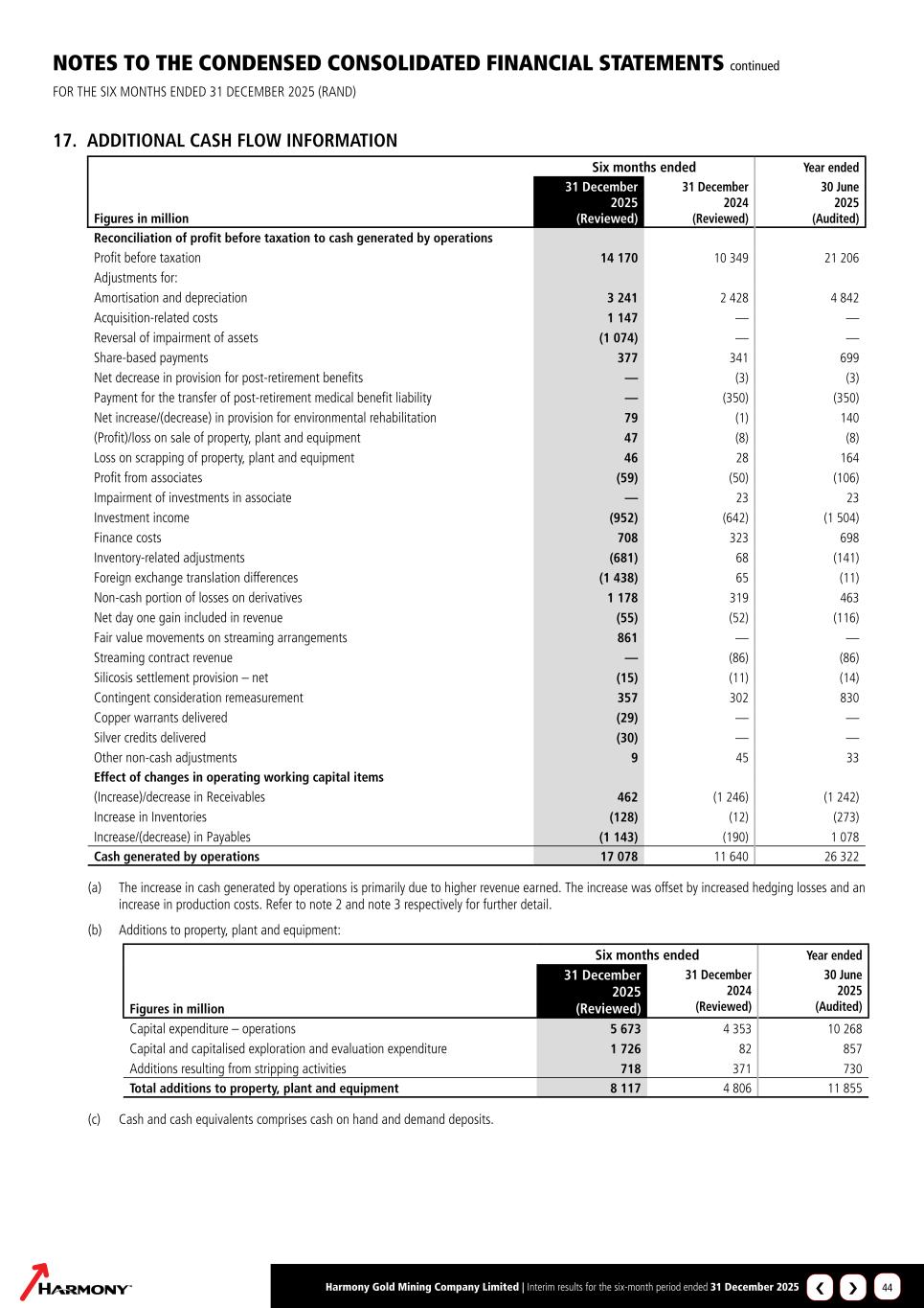 Harmony Gold Mining Company Limited | Interim results for the six-month period ended 31 December 2025 44 NOTES TO THE CONDENSED CONSOLIDATED FINANCIAL STATEMENTS continued FOR THE SIX MONTHS ENDED 31 DECEMBER 2025 (RAND) 17. ADDITIONAL CASH FLOW INFORMATION Six months ended Year ended Figures in million 31 December 2025 (Reviewed) 31 December 2024 (Reviewed) 30 June 2025 (Audited) Reconciliation of profit before taxation to cash generated by operations Profit before taxation 14 170 10 349 21 206 Adjustments for: Amortisation and depreciation 3 241 2 428 4 842 Acquisition-related costs 1 147 — — Reversal of impairment of assets (1 074) — — Share-based payments 377 341 699 Net decrease in provision for post-retirement benefits — (3) (3) Payment for the transfer of post-retirement medical benefit liability — (350) (350) Net increase/(decrease) in provision for environmental rehabilitation 79 (1) 140 (Profit)/loss on sale of property, plant and equipment 47 (8) (8) Loss on scrapping of property, plant and equipment 46 28 164 Profit from associates (59) (50) (106) Impairment of investments in associate — 23 23 Investment income (952) (642) (1 504) Finance costs 708 323 698 Inventory-related adjustments (681) 68 (141) Foreign exchange translation differences (1 438) 65 (11) Non-cash portion of losses on derivatives 1 178 319 463 Net day one gain included in revenue (55) (52) (116) Fair value movements on streaming arrangements 861 — — Streaming contract revenue — (86) (86) Silicosis settlement provision – net (15) (11) (14) Contingent consideration remeasurement 357 302 830 Copper warrants delivered (29) — — Silver credits delivered (30) — — Other non-cash adjustments 9 45 33 Effect of changes in operating working capital items (Increase)/decrease in Receivables 462 (1 246) (1 242) Increase in Inventories (128) (12) (273) Increase/(decrease) in Payables (1 143) (190) 1 078 Cash generated by operations 17 078 11 640 26 322 (a) The increase in cash generated by operations is primarily due to higher revenue earned. The increase was offset by increased hedging losses and an increase in production costs. Refer to note 2 and note 3 respectively for further detail. (b) Additions to property, plant and equipment: Six months ended Year ended Figures in million 31 December 2025 (Reviewed) 31 December 2024 (Reviewed) 30 June 2025 (Audited) Capital expenditure – operations 5 673 4 353 10 268 Capital and capitalised exploration and evaluation expenditure 1 726 82 857 Additions resulting from stripping activities 718 371 730 Total additions to property, plant and equipment 8 117 4 806 11 855 (c) Cash and cash equivalents comprises cash on hand and demand deposits. ›‹