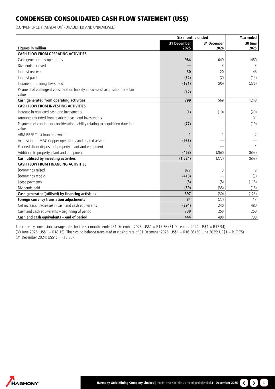 Harmony Gold Mining Company Limited | Interim results for the six-month period ended 31 December 2025 57 Six months ended Year ended Figures in million 31 December 2025 31 December 2024 30 June 2025 CASH FLOW FROM OPERATING ACTIVITIES Cash generated by operations 984 649 1450 Dividends received — 3 3 Interest received 30 20 45 Interest paid (32) (7) (14) Income and mining taxes paid (171) (96) (236) Payment of contingent consideration liability in excess of acquisition date fair value (12) — — Cash generated from operating activities 799 569 1248 CASH FLOW FROM INVESTING ACTIVITIES Increase in restricted cash and investments (1) (10) (20) Amounts refunded from restricted cash and investments — — 31 Payments of contingent consideration liability relating to acquisition date fair value (77) — (19) ARM BBEE Trust loan repayment 1 1 2 Acquisition of MAC Copper operations and related assets (983) — — Proceeds from disposal of property, plant and equipment 4 — 1 Additions to property, plant and equipment (468) (268) (653) Cash utilised by investing activities (1 524) (277) (658) CASH FLOW FROM FINANCING ACTIVITIES Borrowings raised 877 13 12 Borrowings repaid (413) — (3) Lease payments (8) (8) (116) Dividends paid (59) (35) (16) Cash generated/(utilised) by financing activities 397 (30) (123) Foreign currency translation adjustments 34 (22) 13 Net increase/(decrease) in cash and cash equivalents (294) 240 480 Cash and cash equivalents – beginning of period 738 258 258 Cash and cash equivalents – end of period 444 498 738 The currency conversion average rates for the six months ended 31 December 2025: US$1 = R17.36 (31 December 2024: US$1 = R17.94) (30 June 2025: US$1 = R18.15). The closing balance translated at closing rate of 31 December 2025: US$1 = R16.56 (30 June 2025: US$1 = R17.75) (31 December 2024: US$1: = R18.85). CONDENSED CONSOLIDATED CASH FLOW STATEMENT (US$) (CONVENIENCE TRANSLATION) (UNAUDITED AND UNREVIEWED) ›‹
