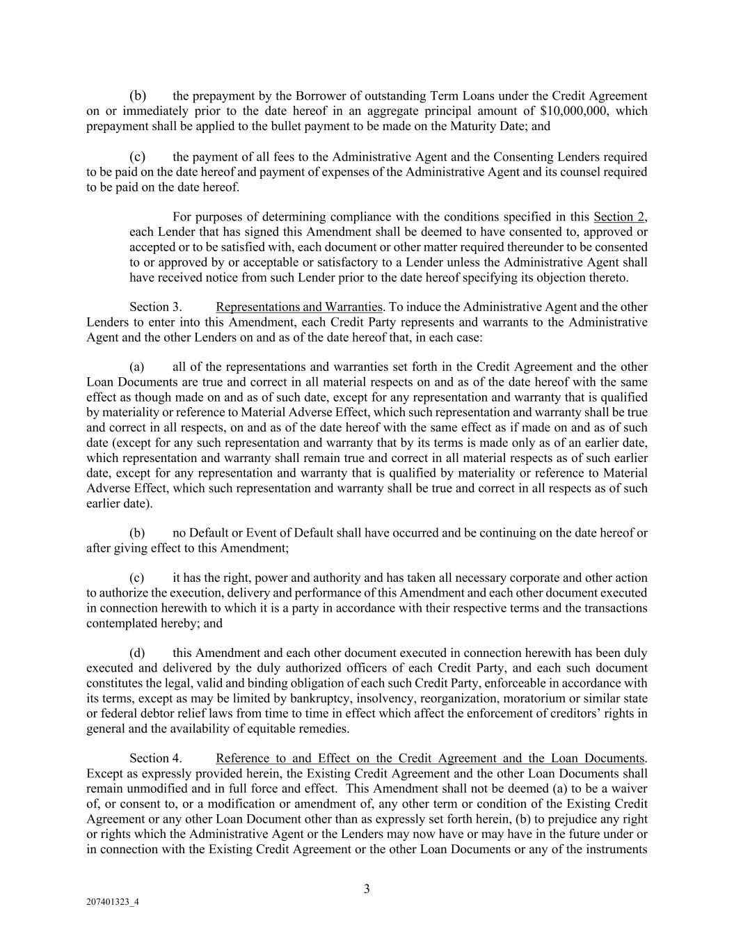 3 207401323_4 (b) the prepayment by the Borrower of outstanding Term Loans under the Credit Agreement on or immediately prior to the date hereof in an aggregate principal amount of $10,000,000, which prepayment shall be applied to the bullet payment to be made on the Maturity Date; and (c) the payment of all fees to the Administrative Agent and the Consenting Lenders required to be paid on the date hereof and payment of expenses of the Administrative Agent and its counsel required to be paid on the date hereof. For purposes of determining compliance with the conditions specified in this Section 2, each Lender that has signed this Amendment shall be deemed to have consented to, approved or accepted or to be satisfied with, each document or other matter required thereunder to be consented to or approved by or acceptable or satisfactory to a Lender unless the Administrative Agent shall have received notice from such Lender prior to the date hereof specifying its objection thereto. Section 3. Representations and Warranties. To induce the Administrative Agent and the other Lenders to enter into this Amendment, each Credit Party represents and warrants to the Administrative Agent and the other Lenders on and as of the date hereof that, in each case: (a) all of the representations and warranties set forth in the Credit Agreement and the other Loan Documents are true and correct in all material respects on and as of the date hereof with the same effect as though made on and as of such date, except for any representation and warranty that is qualified by materiality or reference to Material Adverse Effect, which such representation and warranty shall be true and correct in all respects, on and as of the date hereof with the same effect as if made on and as of such date (except for any such representation and warranty that by its terms is made only as of an earlier date, which representation and warranty shall remain true and correct in all material respects as of such earlier date, except for any representation and warranty that is qualified by materiality or reference to Material Adverse Effect, which such representation and warranty shall be true and correct in all respects as of such earlier date). (b) no Default or Event of Default shall have occurred and be continuing on the date hereof or after giving effect to this Amendment; (c) it has the right, power and authority and has taken all necessary corporate and other action to authorize the execution, delivery and performance of this Amendment and each other document executed in connection herewith to which it is a party in accordance with their respective terms and the transactions contemplated hereby; and (d) this Amendment and each other document executed in connection herewith has been duly executed and delivered by the duly authorized officers of each Credit Party, and each such document constitutes the legal, valid and binding obligation of each such Credit Party, enforceable in accordance with its terms, except as may be limited by bankruptcy, insolvency, reorganization, moratorium or similar state or federal debtor relief laws from time to time in effect which affect the enforcement of creditors’ rights in general and the availability of equitable remedies. Section 4. Reference to and Effect on the Credit Agreement and the Loan Documents. Except as expressly provided herein, the Existing Credit Agreement and the other Loan Documents shall remain unmodified and in full force and effect. This Amendment shall not be deemed (a) to be a waiver of, or consent to, or a modification or amendment of, any other term or condition of the Existing Credit Agreement or any other Loan Document other than as expressly set forth herein, (b) to prejudice any right or rights which the Administrative Agent or the Lenders may now have or may have in the future under or in connection with the Existing Credit Agreement or the other Loan Documents or any of the instruments