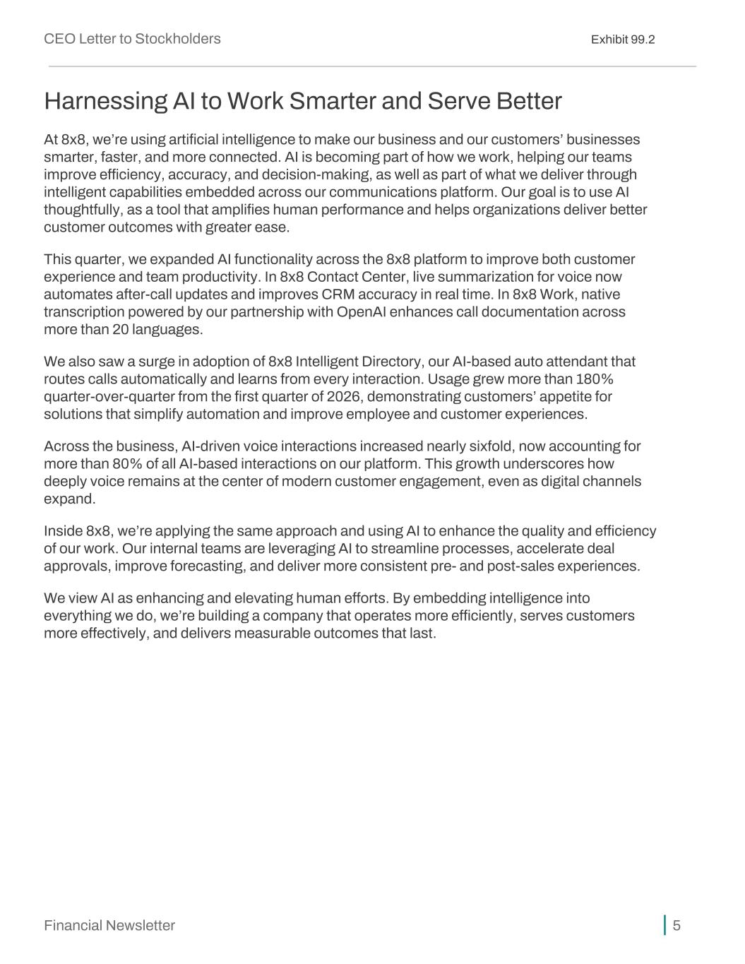 Harnessing AI to Work Smarter and Serve Better At 8x8, we’re using artificial intelligence to make our business and our customers’ businesses smarter, faster, and more connected. AI is becoming part of how we work, helping our teams improve efficiency, accuracy, and decision-making, as well as part of what we deliver through intelligent capabilities embedded across our communications platform. Our goal is to use AI thoughtfully, as a tool that amplifies human performance and helps organizations deliver better customer outcomes with greater ease. This quarter, we expanded AI functionality across the 8x8 platform to improve both customer experience and team productivity. In 8x8 Contact Center, live summarization for voice now automates after-call updates and improves CRM accuracy in real time. In 8x8 Work, native transcription powered by our partnership with OpenAI enhances call documentation across more than 20 languages. We also saw a surge in adoption of 8x8 Intelligent Directory, our AI-based auto attendant that routes calls automatically and learns from every interaction. Usage grew more than 180% quarter-over-quarter from the first quarter of 2026, demonstrating customers’ appetite for solutions that simplify automation and improve employee and customer experiences. Across the business, AI-driven voice interactions increased nearly sixfold, now accounting for more than 80% of all AI-based interactions on our platform. This growth underscores how deeply voice remains at the center of modern customer engagement, even as digital channels expand. Inside 8x8, we’re applying the same approach and using AI to enhance the quality and efficiency of our work. Our internal teams are leveraging AI to streamline processes, accelerate deal approvals, improve forecasting, and deliver more consistent pre- and post-sales experiences. We view AI as enhancing and elevating human efforts. By embedding intelligence into everything we do, we’re building a company that operates more efficiently, serves customers more effectively, and delivers measurable outcomes that last. CEO Letter to Stockholders .2 Financial Newsletter 5