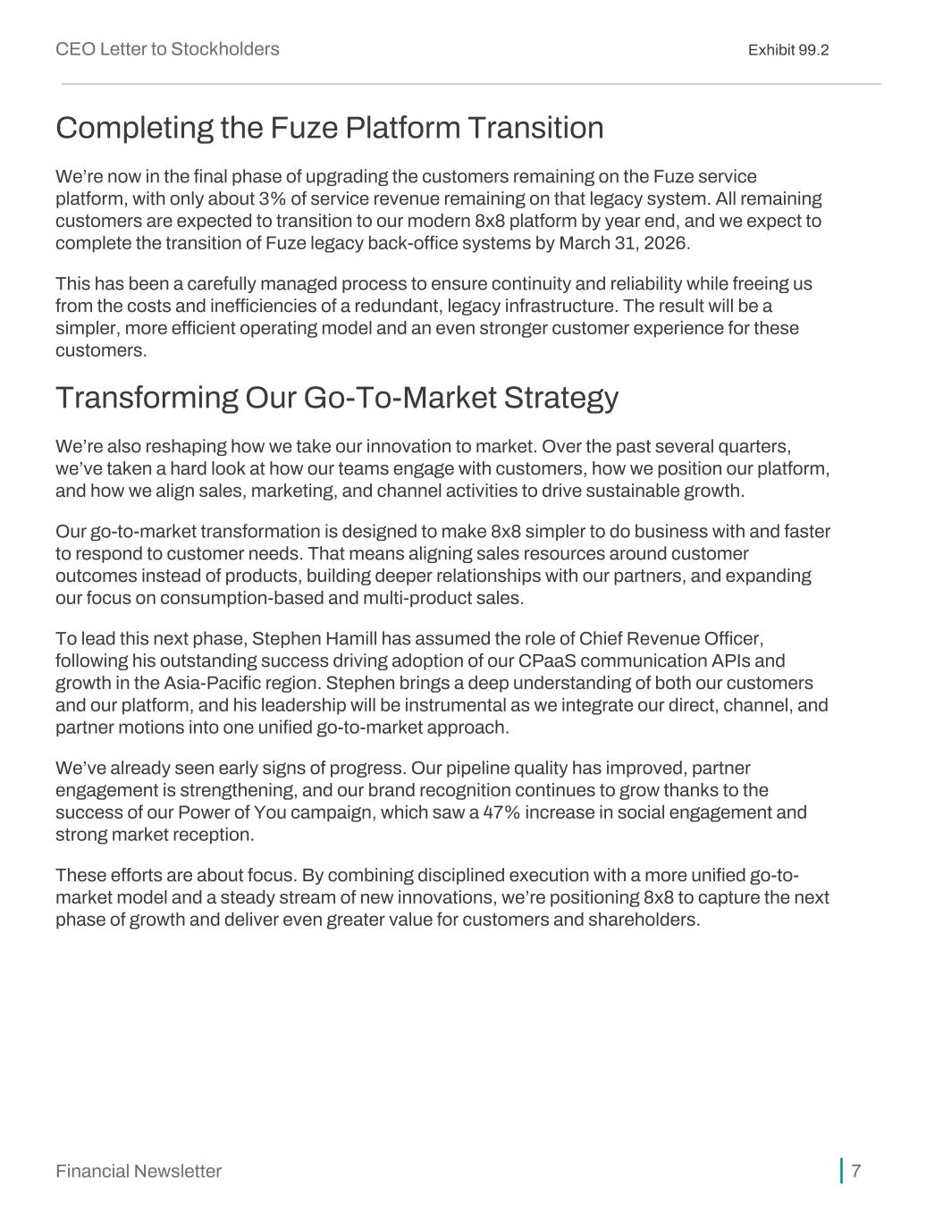 Completing the Fuze Platform Transition We’re now in the final phase of upgrading the customers remaining on the Fuze service platform, with only about 3% of service revenue remaining on that legacy system. All remaining customers are expected to transition to our modern 8x8 platform by year end, and we expect to complete the transition of Fuze legacy back-office systems by March 31, 2026. This has been a carefully managed process to ensure continuity and reliability while freeing us from the costs and inefficiencies of a redundant, legacy infrastructure. The result will be a simpler, more efficient operating model and an even stronger customer experience for these customers. Transforming Our Go-To-Market Strategy We’re also reshaping how we take our innovation to market. Over the past several quarters, we’ve taken a hard look at how our teams engage with customers, how we position our platform, and how we align sales, marketing, and channel activities to drive sustainable growth. Our go-to-market transformation is designed to make 8x8 simpler to do business with and faster to respond to customer needs. That means aligning sales resources around customer outcomes instead of products, building deeper relationships with our partners, and expanding our focus on consumption-based and multi-product sales. To lead this next phase, Stephen Hamill has assumed the role of Chief Revenue Officer, following his outstanding success driving adoption of our CPaaS communication APIs and growth in the Asia-Pacific region. Stephen brings a deep understanding of both our customers and our platform, and his leadership will be instrumental as we integrate our direct, channel, and partner motions into one unified go-to-market approach. We’ve already seen early signs of progress. Our pipeline quality has improved, partner engagement is strengthening, and our brand recognition continues to grow thanks to the success of our Power of You campaign, which saw a 47% increase in social engagement and strong market reception. These efforts are about focus. By combining disciplined execution with a more unified go-to- market model and a steady stream of new innovations, we’re positioning 8x8 to capture the next phase of growth and deliver even greater value for customers and shareholders. CEO Letter to Stockholders .2 Financial Newsletter 7