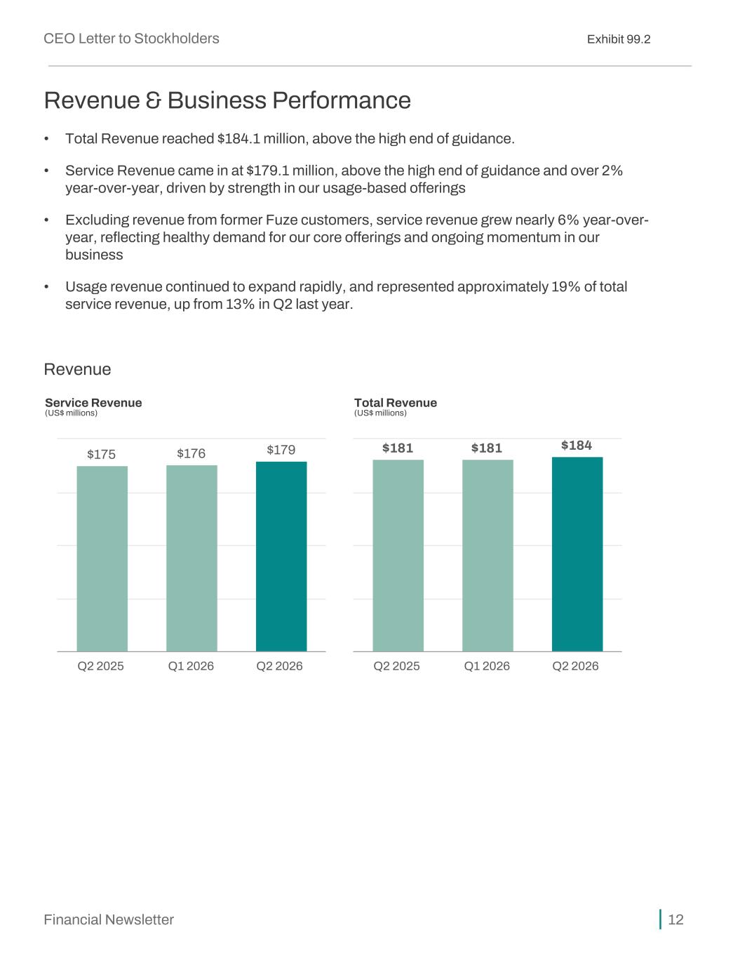 Revenue & Business Performance • Total Revenue reached $184.1 million, above the high end of guidance. • Service Revenue came in at $179.1 million, above the high end of guidance and over 2% year-over-year, driven by strength in our usage-based offerings • Excluding revenue from former Fuze customers, service revenue grew nearly 6% year-over- year, reflecting healthy demand for our core offerings and ongoing momentum in our business • Usage revenue continued to expand rapidly, and represented approximately 19% of total service revenue, up from 13% in Q2 last year. Revenue Service Revenue (US$ millions) Total Revenue (US$ millions) $175 $176 $179 Q2 2025 Q1 2026 Q2 2026 $181 $181 $184 Q2 2025 Q1 2026 Q2 2026 CEO Letter to Stockholders .2 Financial Newsletter 12