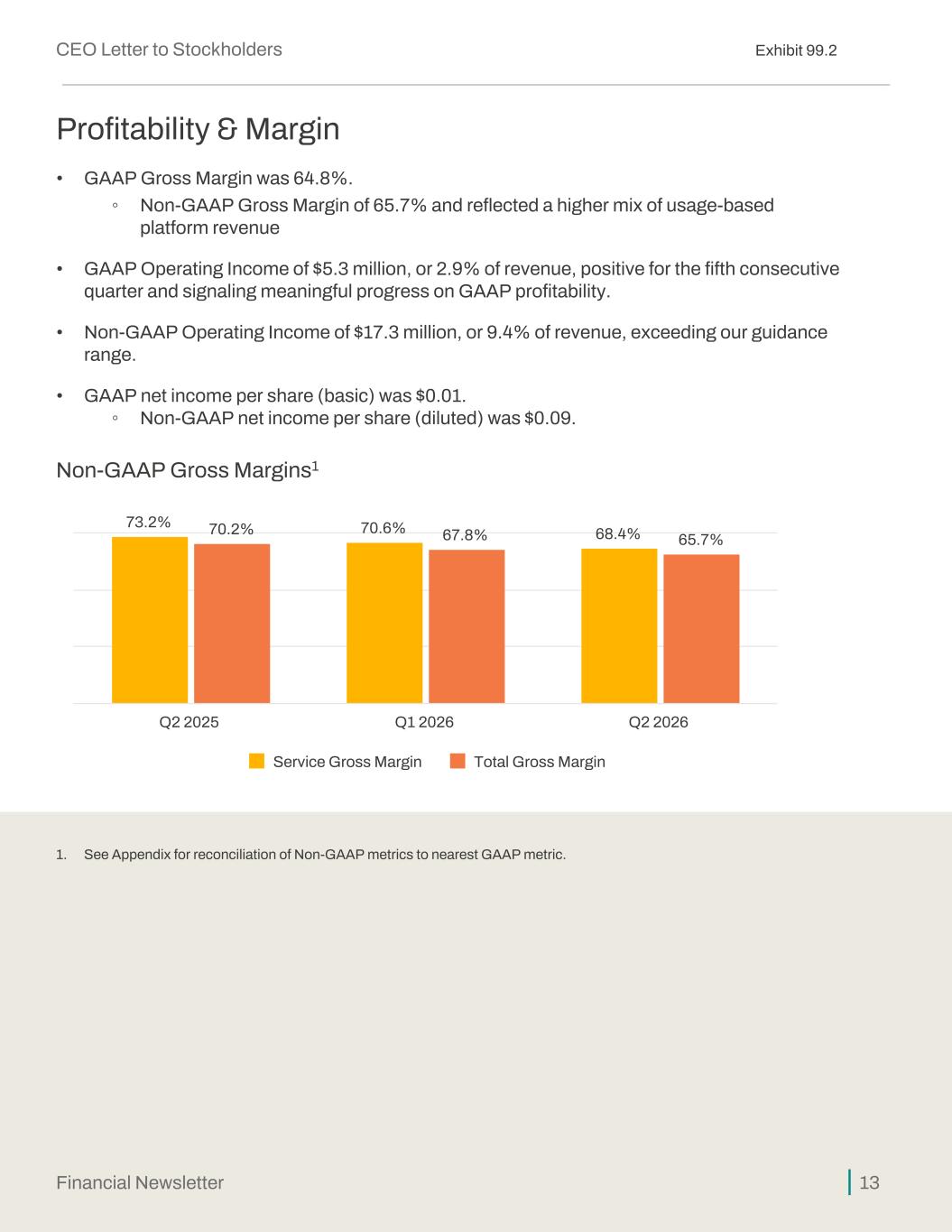 Profitability & Margin • GAAP Gross Margin was 64.8%. ◦ Non-GAAP Gross Margin of 65.7% and reflected a higher mix of usage-based platform revenue • GAAP Operating Income of $5.3 million, or 2.9% of revenue, positive for the fifth consecutive quarter and signaling meaningful progress on GAAP profitability. • Non-GAAP Operating Income of $17.3 million, or 9.4% of revenue, exceeding our guidance range. • GAAP net income per share (basic) was $0.01. ◦ Non-GAAP net income per share (diluted) was $0.09. Non-GAAP Gross Margins1 73.2% 70.6% 68.4%70.2% 67.8% 65.7% Service Gross Margin Total Gross Margin Q2 2025 Q1 2026 Q2 2026 1. See Appendix for reconciliation of Non-GAAP metrics to nearest GAAP metric. CEO Letter to Stockholders .2 Financial Newsletter 13