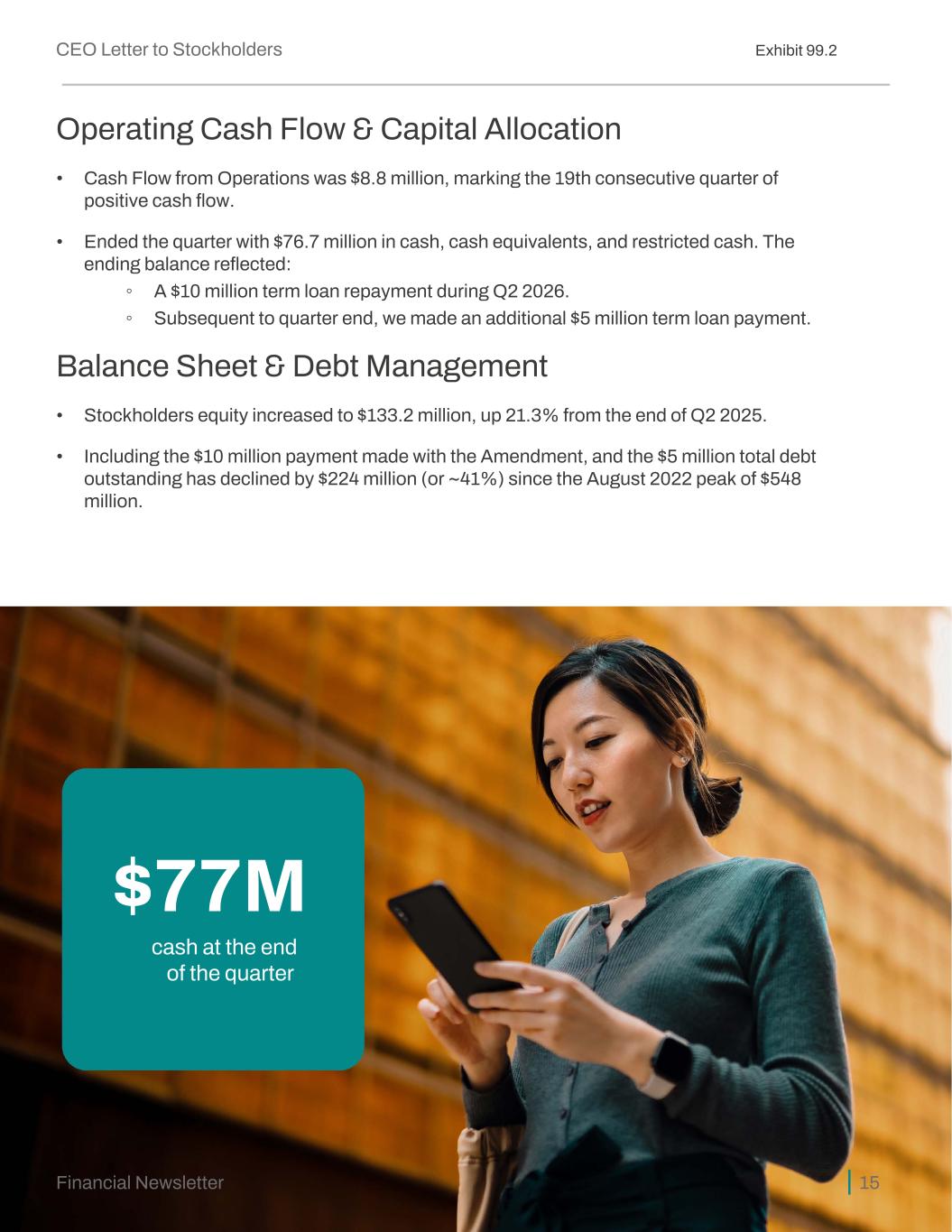 Operating Cash Flow & Capital Allocation • Cash Flow from Operations was $8.8 million, marking the 19th consecutive quarter of positive cash flow. • Ended the quarter with $76.7 million in cash, cash equivalents, and restricted cash. The ending balance reflected: ◦ A $10 million term loan repayment during Q2 2026. ◦ Subsequent to quarter end, we made an additional $5 million term loan payment. Balance Sheet & Debt Management • Stockholders equity increased to $133.2 million, up 21.3% from the end of Q2 2025. • Including the $10 million payment made with the Amendment, and the $5 million total debt outstanding has declined by $224 million (or ~41%) since the August 2022 peak of $548 million. $77M cash at the end of the quarter CEO Letter to Stockholders .2 Financial Newsletter 15