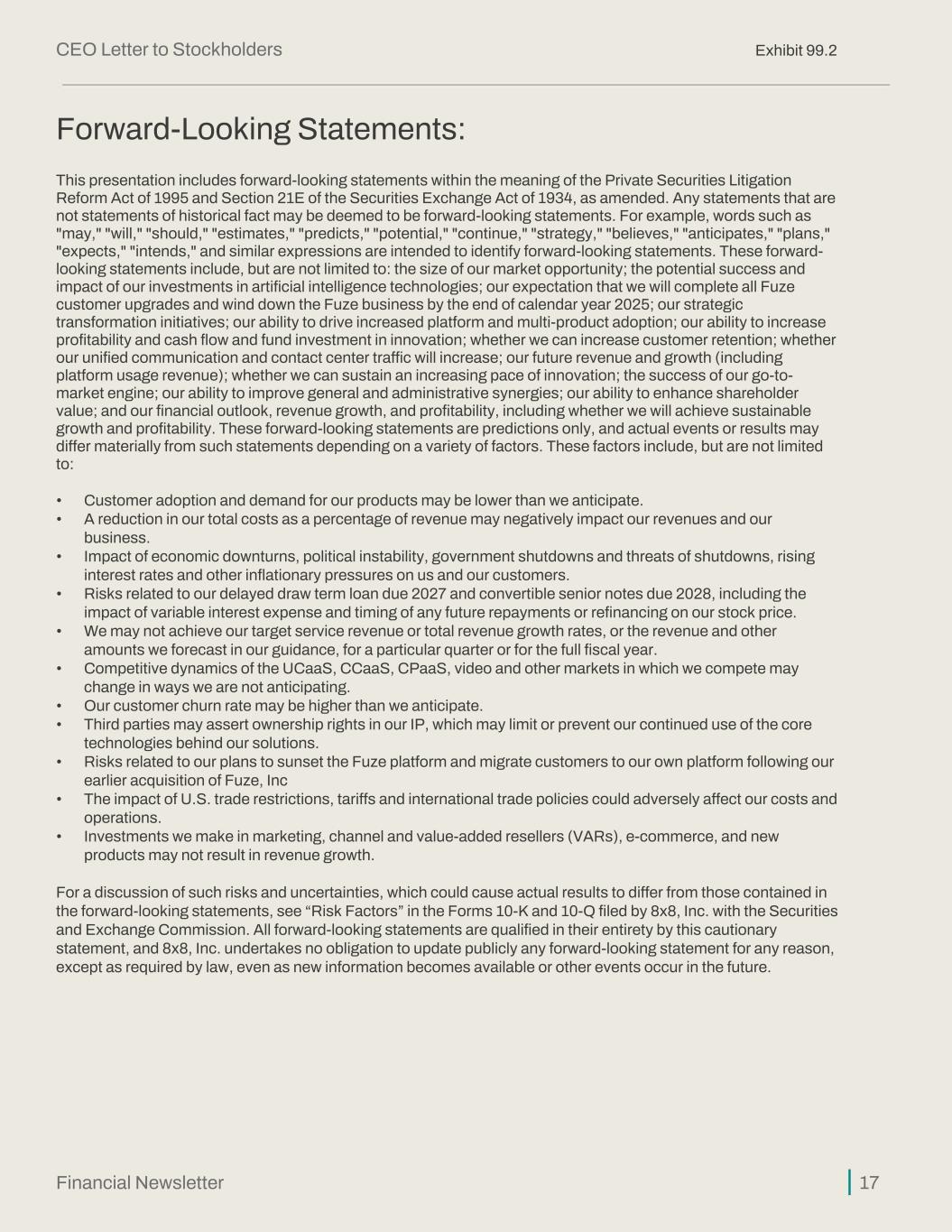Forward-Looking Statements: This presentation includes forward-looking statements within the meaning of the Private Securities Litigation Reform Act of 1995 and Section 21E of the Securities Exchange Act of 1934, as amended. Any statements that are not statements of historical fact may be deemed to be forward-looking statements. For example, words such as "may," "will," "should," "estimates," "predicts," "potential," "continue," "strategy," "believes," "anticipates," "plans," "expects," "intends," and similar expressions are intended to identify forward-looking statements. These forward- looking statements include, but are not limited to: the size of our market opportunity; the potential success and impact of our investments in artificial intelligence technologies; our expectation that we will complete all Fuze customer upgrades and wind down the Fuze business by the end of calendar year 2025; our strategic transformation initiatives; our ability to drive increased platform and multi-product adoption; our ability to increase profitability and cash flow and fund investment in innovation; whether we can increase customer retention; whether our unified communication and contact center traffic will increase; our future revenue and growth (including platform usage revenue); whether we can sustain an increasing pace of innovation; the success of our go-to- market engine; our ability to improve general and administrative synergies; our ability to enhance shareholder value; and our financial outlook, revenue growth, and profitability, including whether we will achieve sustainable growth and profitability. These forward-looking statements are predictions only, and actual events or results may differ materially from such statements depending on a variety of factors. These factors include, but are not limited to: • Customer adoption and demand for our products may be lower than we anticipate. • A reduction in our total costs as a percentage of revenue may negatively impact our revenues and our business. • Impact of economic downturns, political instability, government shutdowns and threats of shutdowns, rising interest rates and other inflationary pressures on us and our customers. • Risks related to our delayed draw term loan due 2027 and convertible senior notes due 2028, including the impact of variable interest expense and timing of any future repayments or refinancing on our stock price. • We may not achieve our target service revenue or total revenue growth rates, or the revenue and other amounts we forecast in our guidance, for a particular quarter or for the full fiscal year. • Competitive dynamics of the UCaaS, CCaaS, CPaaS, video and other markets in which we compete may change in ways we are not anticipating. • Our customer churn rate may be higher than we anticipate. • Third parties may assert ownership rights in our IP, which may limit or prevent our continued use of the core technologies behind our solutions. • Risks related to our plans to sunset the Fuze platform and migrate customers to our own platform following our earlier acquisition of Fuze, Inc • The impact of U.S. trade restrictions, tariffs and international trade policies could adversely affect our costs and operations. • Investments we make in marketing, channel and value-added resellers (VARs), e-commerce, and new products may not result in revenue growth. For a discussion of such risks and uncertainties, which could cause actual results to differ from those contained in the forward-looking statements, see “Risk Factors” in the Forms 10-K and 10-Q filed by 8x8, Inc. with the Securities and Exchange Commission. All forward-looking statements are qualified in their entirety by this cautionary statement, and 8x8, Inc. undertakes no obligation to update publicly any forward-looking statement for any reason, except as required by law, even as new information becomes available or other events occur in the future. CEO Letter to Stockholders .2 Financial Newsletter 17