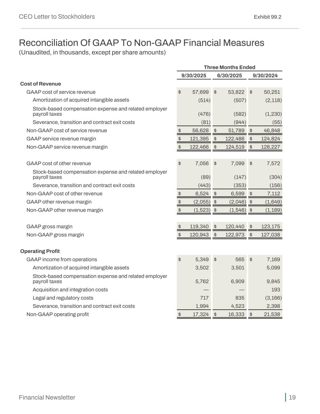 Reconciliation Of GAAP To Non-GAAP Financial Measures (Unaudited, in thousands, except per share amounts) Three Months Ended 9/30/2025 6/30/2025 9/30/2024 Cost of Revenue GAAP cost of service revenue $ 57,699 $ 53,822 $ 50,251 Amortization of acquired intangible assets (514) (507) (2,118) Stock-based compensation expense and related employer payroll taxes (476) (582) (1,230) Severance, transition and contract exit costs (81) (944) (55) Non-GAAP cost of service revenue $ 56,628 $ 51,789 $ 46,848 GAAP service revenue margin $ 121,395 $ 122,486 $ 124,824 Non-GAAP service revenue margin $ 122,466 $ 124,519 $ 128,227 GAAP cost of other revenue $ 7,056 $ 7,099 $ 7,572 Stock-based compensation expense and related employer payroll taxes (89) (147) (304) Severance, transition and contract exit costs (443) (353) (156) Non-GAAP cost of other revenue $ 6,524 $ 6,599 $ 7,112 GAAP other revenue margin $ (2,055) $ (2,046) $ (1,649) Non-GAAP other revenue margin $ (1,523) $ (1,546) $ (1,189) GAAP gross margin $ 119,340 $ 120,440 $ 123,175 Non-GAAP gross margin $ 120,943 $ 122,973 $ 127,038 Operating Profit GAAP income from operations $ 5,349 $ 565 $ 7,169 Amortization of acquired intangible assets 3,502 3,501 5,099 Stock-based compensation expense and related employer payroll taxes 5,762 6,909 9,845 Acquisition and integration costs — — 193 Legal and regulatory costs 717 835 (3,166) Severance, transition and contract exit costs 1,994 4,523 2,398 Non-GAAP operating profit $ 17,324 $ 16,333 $ 21,538 CEO Letter to Stockholders .2 Financial Newsletter 19