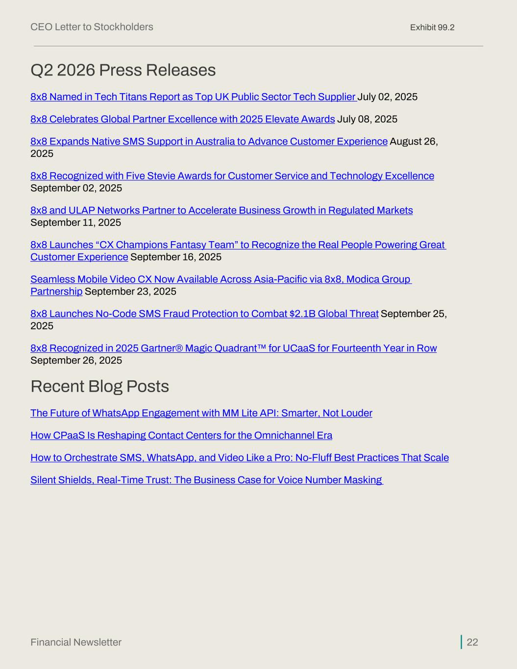 Recognition and Awards • Named a Leader in the IDC MarketScape: European Contact Center-as-a-Service Applications Software 2025 Vendor Assessment • Awarded Best Communications Provider-Enterprise by the Comms Council UK. • Recognized in the 2025 Gartner Magic Quadrant for Unified Communications as a Service. • Named in Tech Titans Report as Top UK Public Sector Tech Supplier. • Recognized across five categories in the 22nd Annual International Business Awards®, including a Gold Stevie® Award for Customer Service Executive of the Year. • Won Platinum Pinnacle Marketing & Comms Award for AI-powered Marketing Innovation for the Power of You. • Won Platinum MarCom Award for Social Media Marketing Campaign for the Power of You. Corporate and Leadership Updates Demonstrating its continued focus on long-term profitability, operational efficiency, and execution excellence, 8x8 advanced both its leadership strategy and financial discipline during the quarter. • Appointed Stephen Hamill as Chief Revenue Officer, following his success driving global adoption of 8x8’s CPaaS solutions. • Made a $10 million early term loan payment, with an additional $5 million paid in October, bringing total debt reduction to $224 million, or 41%, since August 2022—reflecting the company’s commitment to disciplined capital management and profitable growth. These actions reinforce 8x8’s strategy to drive sustainable innovation and deliver lasting shareholder value. CEO Letter to Stockholders .2 Financial Newsletter 21