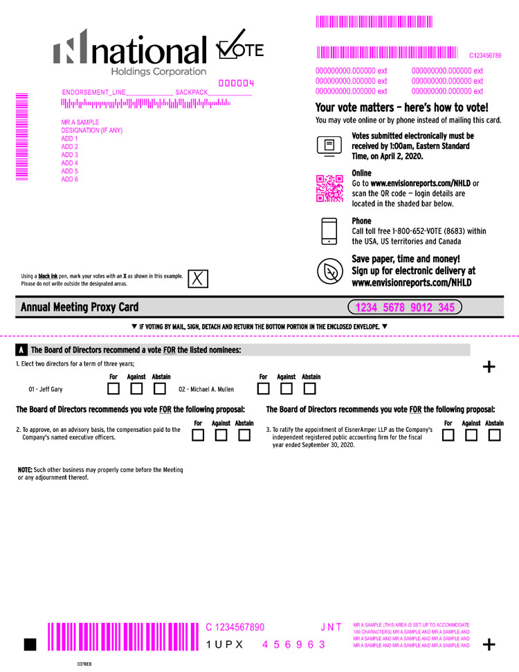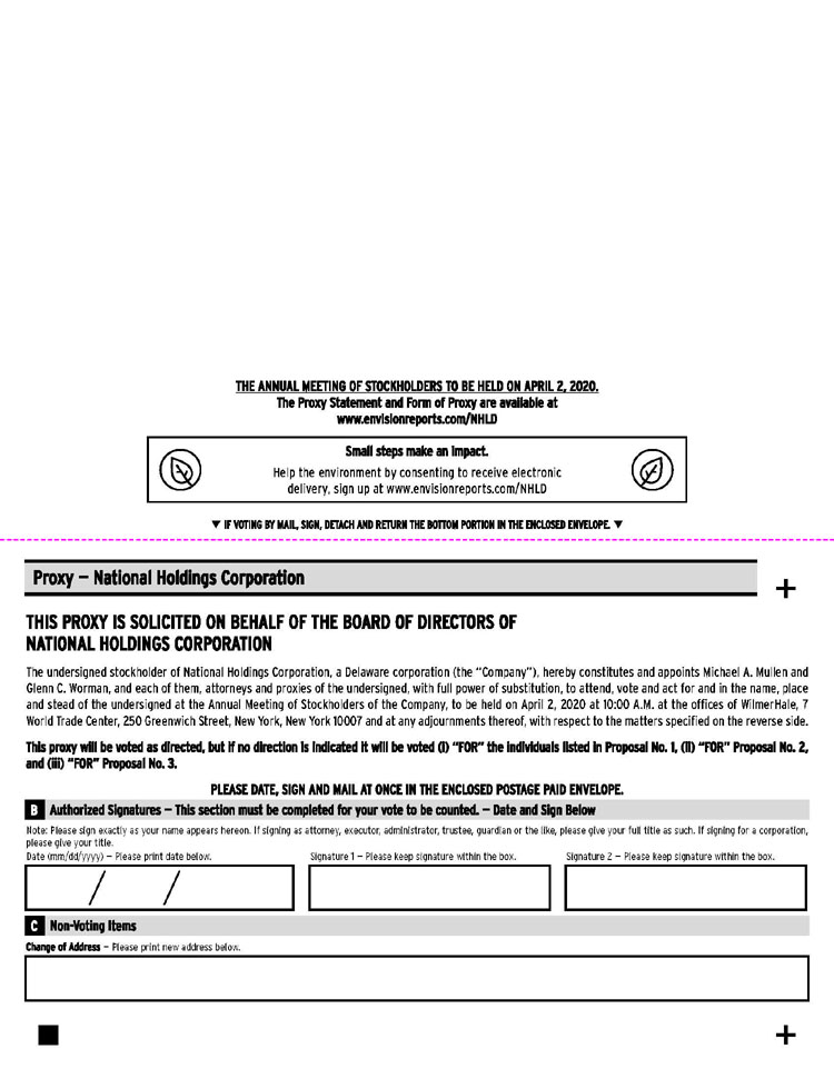 You are cordially invited to the Annual Meeting of Stockholders (the “Annual Meeting”) of National Holdings Corporation (“National” or the “Company”), to be held at 10:00 a.m. local time, on Thursday, April 2, 2020, at the offices of our legal counsel, Wilmer Cutler Pickering Hale and Dorr LLP, located at 7 World Trade Center, 250 Greenwich Street, New York, New York 10007. At the meeting, the stockholders will be asked to (i) elect two directors for a term of three years, (ii) approve, on an advisory basis, the compensation paid to the Company's named executive officers, and (iii) ratify the appointment of EisnerAmper LLP as our independent registered public accounting firm for the fiscal year ended September 30, 2020. You will also have the opportunity to ask questions and make comments at the meeting.