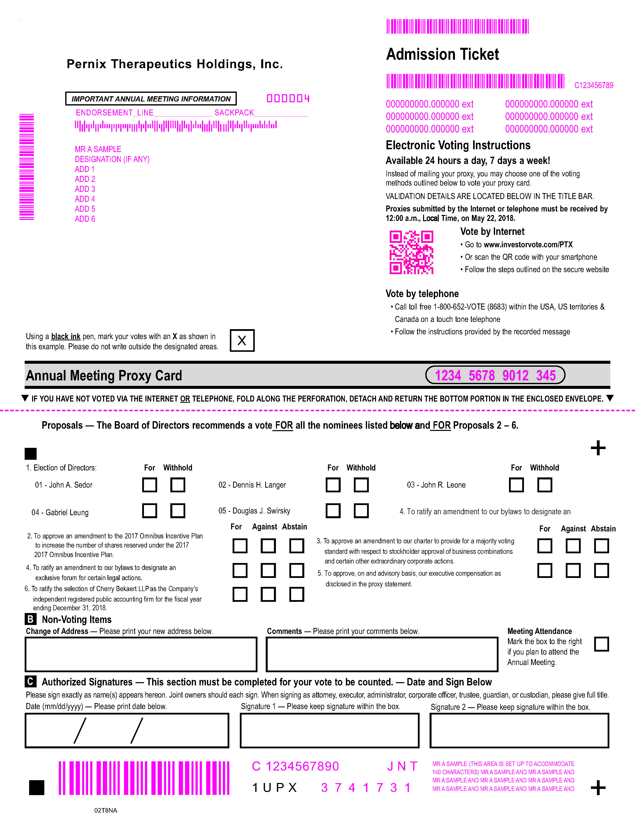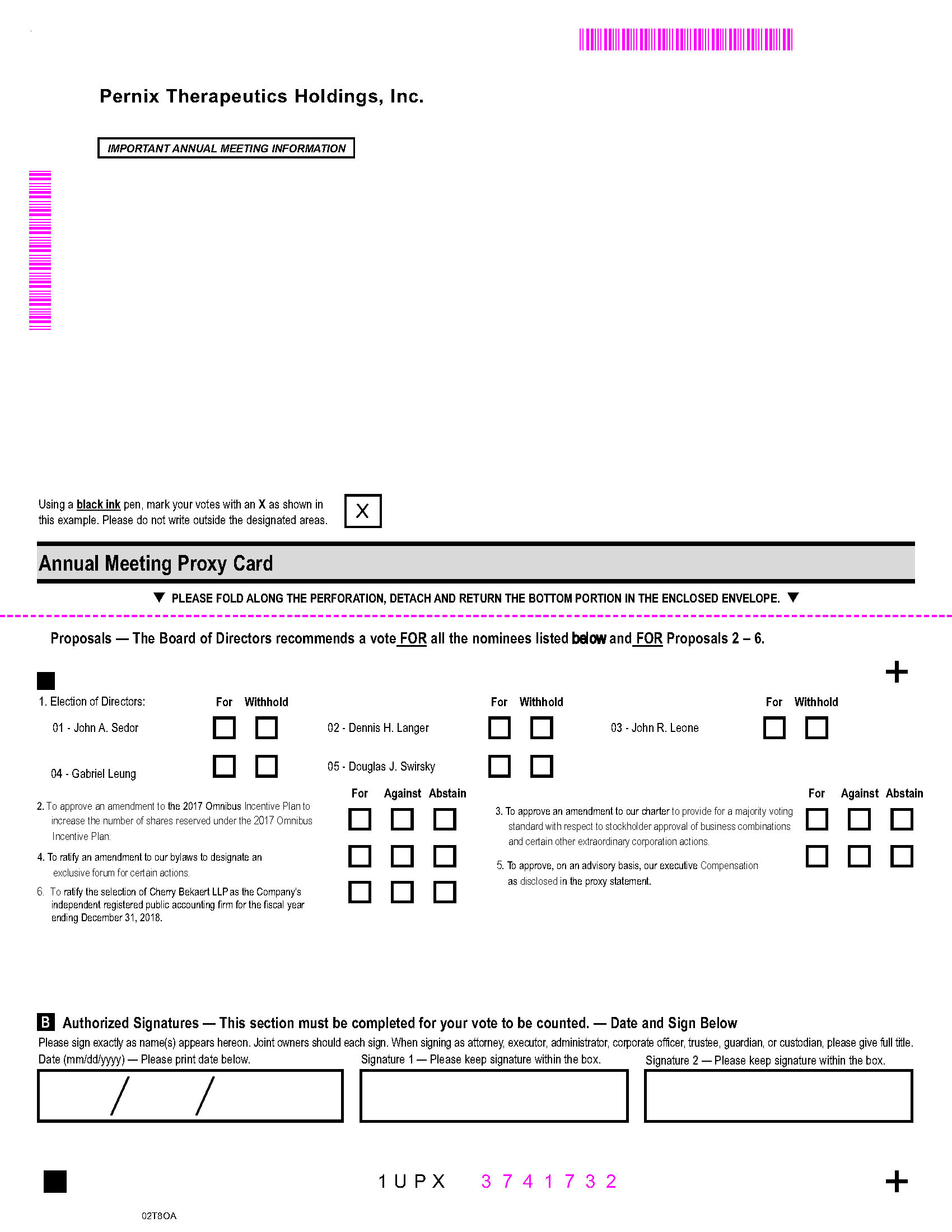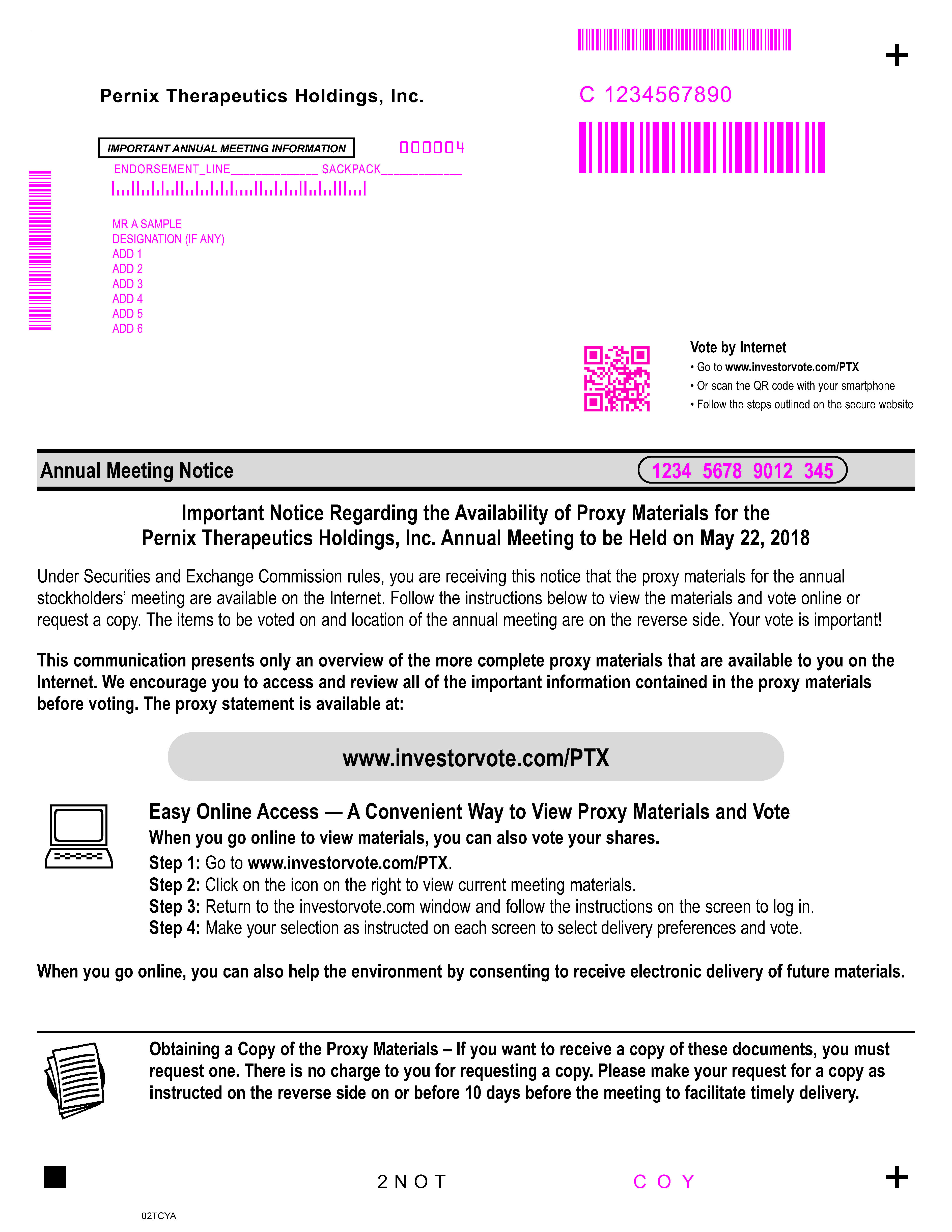 You are receiving these proxy materials because you owned shares of common stock of our company, Pernix Therapeutics Holdings, Inc., or we, us, and the Company, at the close of business on March 28, 2018, and, therefore, are eligible to vote at our 2018 Annual meeting of Stockholders, or the 2018 Annual Meeting. Our board of directors, or the Board, is soliciting your proxy to vote at the 2018 Annual Meeting. |