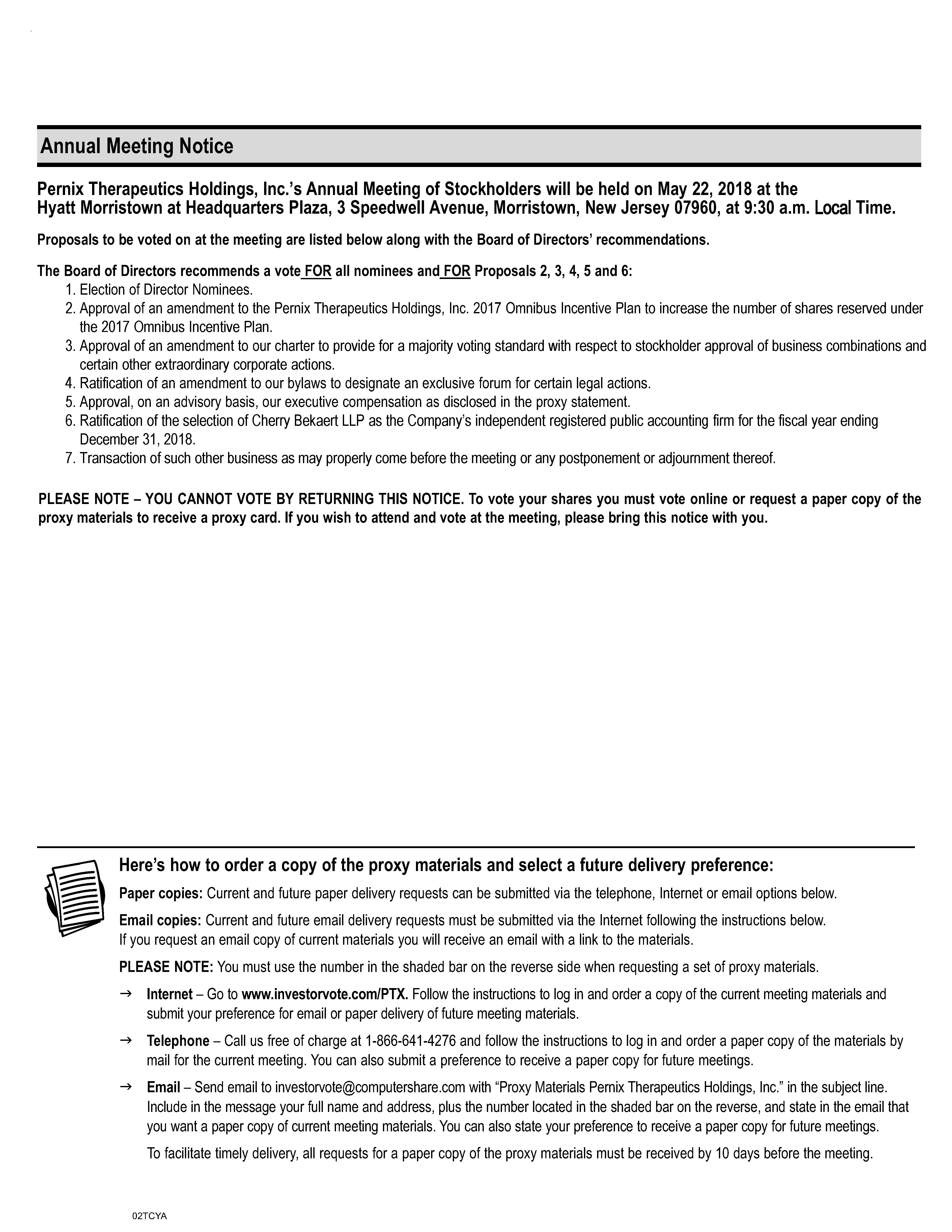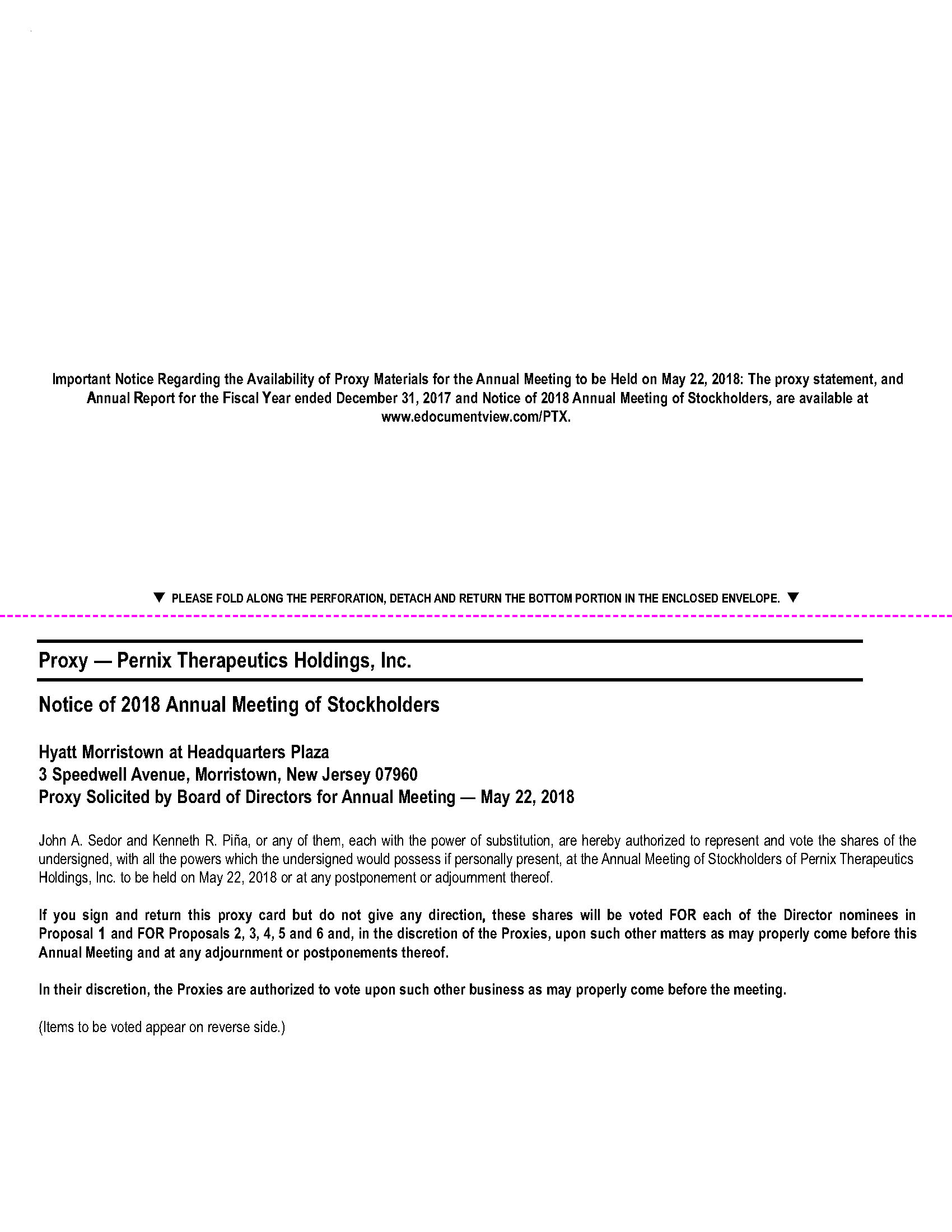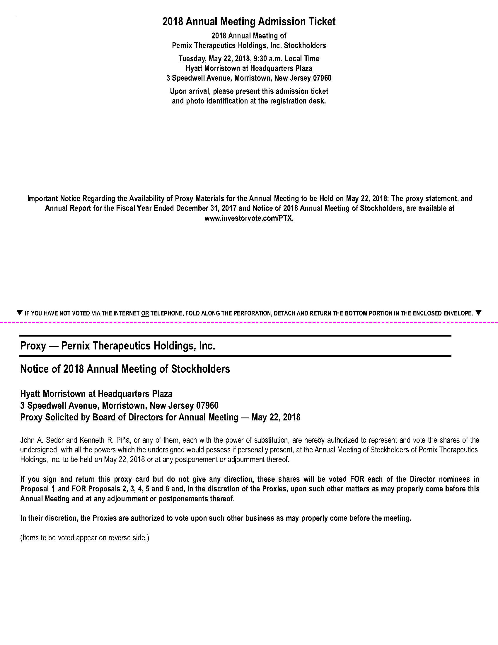 The 2018 Annual Meeting of the Stockholders of Pernix Therapeutics Holdings, Inc., a Maryland corporation (hereinafter, "we," "us," and the "Company"), will be held at the Hyatt Morristown at Headquarters Plaza, 3 Speedwell Avenue, Morristown, New Jersey 07960, on May 22, 2018 at 9:30 a.m., local time, to vote upon the following matters: