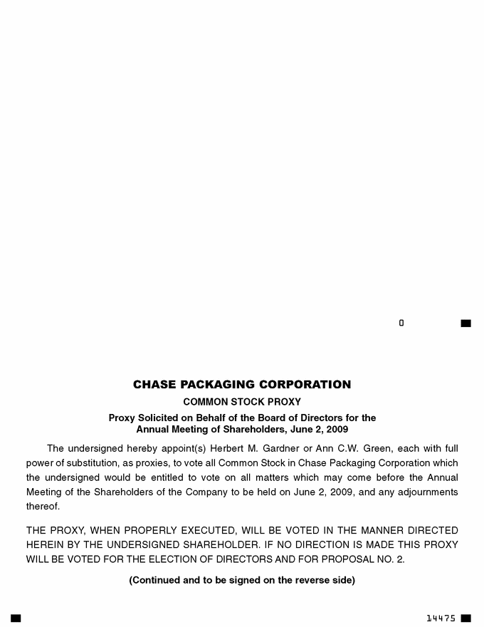 0 --------------- . . . . . . . . . . . . . . . . . . . . . . . . . . . . . . . . . . . . . . . . . . . . . . . . . . . . . . ---------------- 14475 CHASE PACKAGING CORPORATION COMMON STOCK PROXY Proxy Solicited on Behalf of the Board of Directors for the Annual Meeting of Shareholders, June 2, 2009 The undersigned hereby appoint(s) Herbert M. Gardner or Ann C.W. Green, each with full power of substitution, as proxies, to vote all Common Stock in Chase Packaging Corporation which the undersigned would be entitled to vote on all matters which may come before the Annual Meeting of the Shareholders of the Company to be held on June 2, 2009, and any adjournments thereof. THE PROXY, WHEN PROPERLY EXECUTED, WILL BE VOTED IN THE MANNER DIRECTED HEREIN BY THE UNDERSIGNED SHAREHOLDER. IF NO DIRECTION IS MADE THIS PROXY WILL BE VOTED FOR THE ELECTION OF DIRECTORS AND FOR PROPOSAL NO. 2. (Continued and to be signed on the reverse side) |
