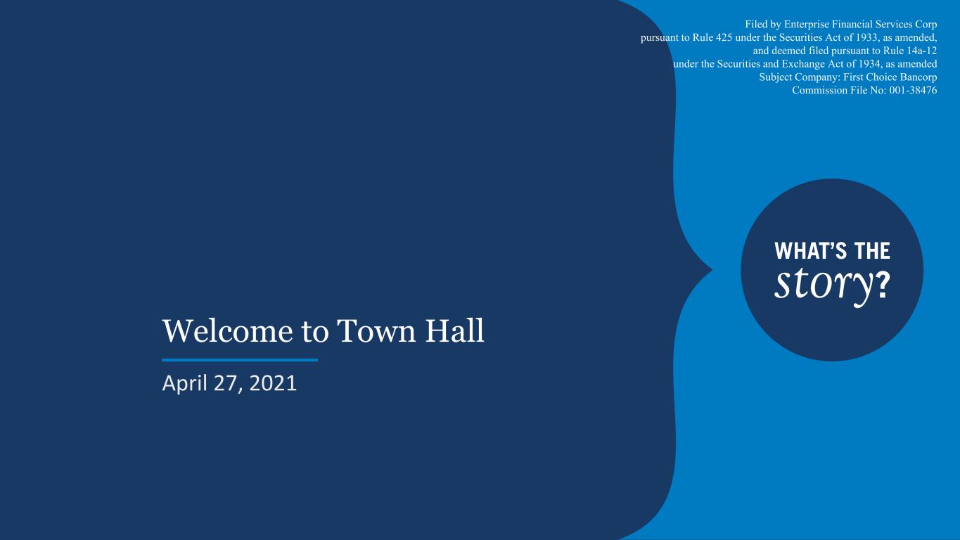 Welcome to Town Hall April 27, 2021 Filed by Enterprise Financial Services Corp pursuant to Rule 425 under the Securities Act of 1933, as amended, and deemed filed pursuant to Rule 14a-12 under the Securities and Exchange Act of 1934, as amended Subject Company: First Choice Bancorp Commission File No: 001-38476