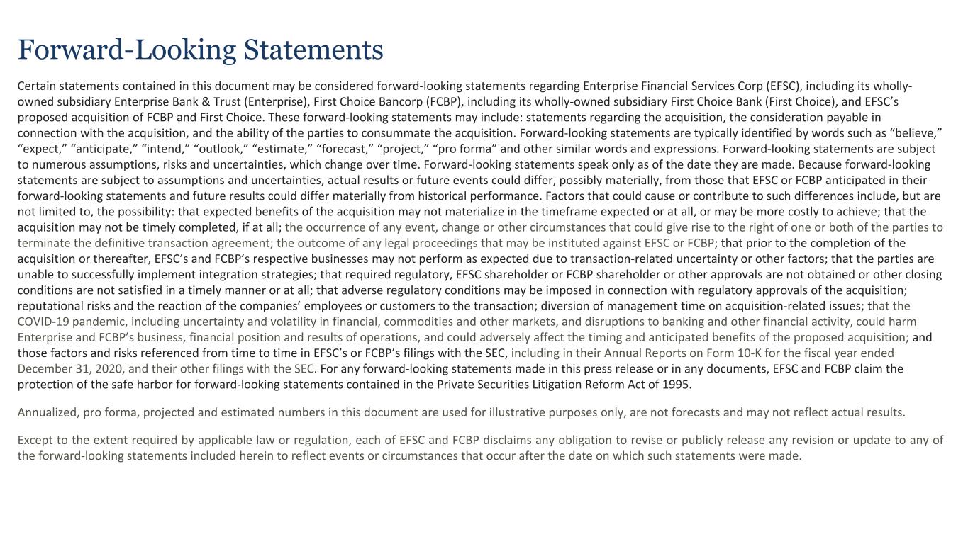 Forward-Looking Statements Certain statements contained in this document may be considered forward-looking statements regarding Enterprise Financial Services Corp (EFSC), including its wholly- owned subsidiary Enterprise Bank & Trust (Enterprise), First Choice Bancorp (FCBP), including its wholly-owned subsidiary First Choice Bank (First Choice), and EFSC’s proposed acquisition of FCBP and First Choice. These forward-looking statements may include: statements regarding the acquisition, the consideration payable in connection with the acquisition, and the ability of the parties to consummate the acquisition. Forward-looking statements are typically identified by words such as “believe,” “expect,” “anticipate,” “intend,” “outlook,” “estimate,” “forecast,” “project,” “pro forma” and other similar words and expressions. Forward-looking statements are subject to numerous assumptions, risks and uncertainties, which change over time. Forward-looking statements speak only as of the date they are made. Because forward-looking statements are subject to assumptions and uncertainties, actual results or future events could differ, possibly materially, from those that EFSC or FCBP anticipated in their forward-looking statements and future results could differ materially from historical performance. Factors that could cause or contribute to such differences include, but are not limited to, the possibility: that expected benefits of the acquisition may not materialize in the timeframe expected or at all, or may be more costly to achieve; that the acquisition may not be timely completed, if at all; the occurrence of any event, change or other circumstances that could give rise to the right of one or both of the parties to terminate the definitive transaction agreement; the outcome of any legal proceedings that may be instituted against EFSC or FCBP; that prior to the completion of the acquisition or thereafter, EFSC’s and FCBP’s respective businesses may not perform as expected due to transaction-related uncertainty or other factors; that the parties are unable to successfully implement integration strategies; that required regulatory, EFSC shareholder or FCBP shareholder or other approvals are not obtained or other closing conditions are not satisfied in a timely manner or at all; that adverse regulatory conditions may be imposed in connection with regulatory approvals of the acquisition; reputational risks and the reaction of the companies’ employees or customers to the transaction; diversion of management time on acquisition-related issues; that the COVID-19 pandemic, including uncertainty and volatility in financial, commodities and other markets, and disruptions to banking and other financial activity, could harm Enterprise and FCBP’s business, financial position and results of operations, and could adversely affect the timing and anticipated benefits of the proposed acquisition; and those factors and risks referenced from time to time in EFSC’s or FCBP’s filings with the SEC, including in their Annual Reports on Form 10-K for the fiscal year ended December 31, 2020, and their other filings with the SEC. For any forward-looking statements made in this press release or in any documents, EFSC and FCBP claim the protection of the safe harbor for forward-looking statements contained in the Private Securities Litigation Reform Act of 1995. Annualized, pro forma, projected and estimated numbers in this document are used for illustrative purposes only, are not forecasts and may not reflect actual results. Except to the extent required by applicable law or regulation, each of EFSC and FCBP disclaims any obligation to revise or publicly release any revision or update to any of the forward-looking statements included herein to reflect events or circumstances that occur after the date on which such statements were made.