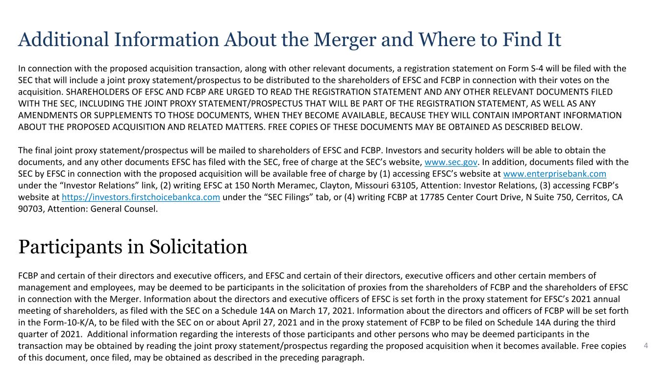 4 Additional Information About the Merger and Where to Find It In connection with the proposed acquisition transaction, along with other relevant documents, a registration statement on Form S-4 will be filed with the SEC that will include a joint proxy statement/prospectus to be distributed to the shareholders of EFSC and FCBP in connection with their votes on the acquisition. SHAREHOLDERS OF EFSC AND FCBP ARE URGED TO READ THE REGISTRATION STATEMENT AND ANY OTHER RELEVANT DOCUMENTS FILED WITH THE SEC, INCLUDING THE JOINT PROXY STATEMENT/PROSPECTUS THAT WILL BE PART OF THE REGISTRATION STATEMENT, AS WELL AS ANY AMENDMENTS OR SUPPLEMENTS TO THOSE DOCUMENTS, WHEN THEY BECOME AVAILABLE, BECAUSE THEY WILL CONTAIN IMPORTANT INFORMATION ABOUT THE PROPOSED ACQUISITION AND RELATED MATTERS. FREE COPIES OF THESE DOCUMENTS MAY BE OBTAINED AS DESCRIBED BELOW. The final joint proxy statement/prospectus will be mailed to shareholders of EFSC and FCBP. Investors and security holders will be able to obtain the documents, and any other documents EFSC has filed with the SEC, free of charge at the SEC’s website, www.sec.gov. In addition, documents filed with the SEC by EFSC in connection with the proposed acquisition will be available free of charge by (1) accessing EFSC’s website at www.enterprisebank.com under the “Investor Relations” link, (2) writing EFSC at 150 North Meramec, Clayton, Missouri 63105, Attention: Investor Relations, (3) accessing FCBP’s website at https://investors.firstchoicebankca.com under the “SEC Filings” tab, or (4) writing FCBP at 17785 Center Court Drive, N Suite 750, Cerritos, CA 90703, Attention: General Counsel. Participants in Solicitation FCBP and certain of their directors and executive officers, and EFSC and certain of their directors, executive officers and other certain members of management and employees, may be deemed to be participants in the solicitation of proxies from the shareholders of FCBP and the shareholders of EFSC in connection with the Merger. Information about the directors and executive officers of EFSC is set forth in the proxy statement for EFSC’s 2021 annual meeting of shareholders, as filed with the SEC on a Schedule 14A on March 17, 2021. Information about the directors and officers of FCBP will be set forth in the Form-10-K/A, to be filed with the SEC on or about April 27, 2021 and in the proxy statement of FCBP to be filed on Schedule 14A during the third quarter of 2021. Additional information regarding the interests of those participants and other persons who may be deemed participants in the transaction may be obtained by reading the joint proxy statement/prospectus regarding the proposed acquisition when it becomes available. Free copies of this document, once filed, may be obtained as described in the preceding paragraph.
