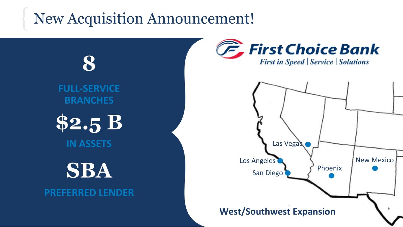 New Acquisition Announcement! 6 8 IN ASSETS $2.5 B SBA PREFERRED LENDER FULL-SERVICE BRANCHES West/Southwest Expansion New Mexico Phoenix Las Vegas San Diego Los Angeles
