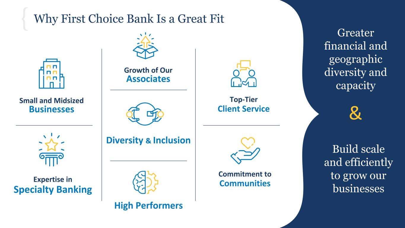 7 Why First Choice Bank Is a Great Fit Greater financial and geographic diversity and capacity Build scale and efficiently to grow our businesses Small and Midsized Businesses Expertise in Specialty Banking High Performers Top-Tier Client Service Growth of Our Associates Diversity & Inclusion & Commitment to Communities