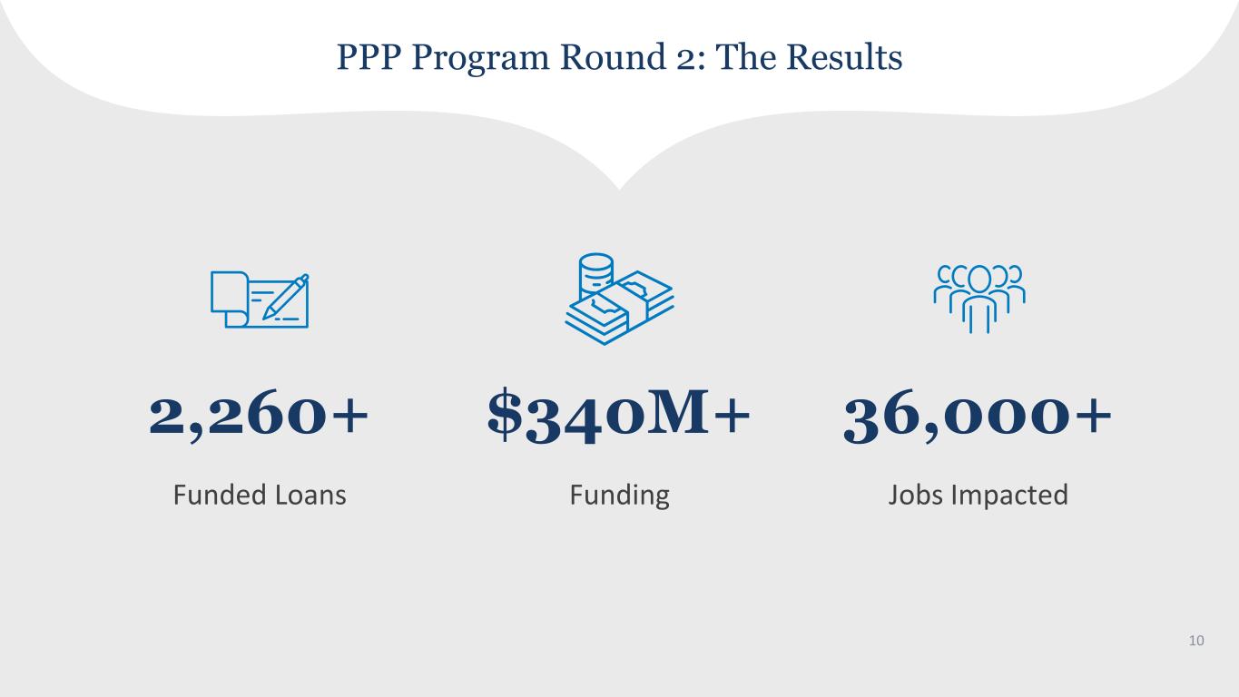 PPP Program Round 2: The Results 10 Funding $340M+ Funded Loans 2,260+ Jobs Impacted 36,000+