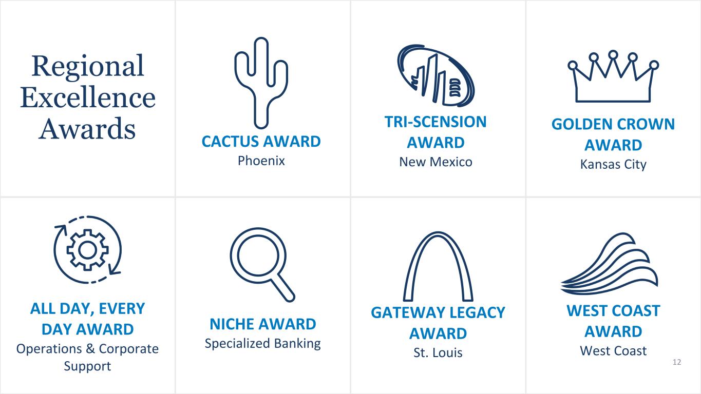 GOLDEN CROWN AWARD Kansas City Regional Excellence Awards 12 CACTUS AWARD Phoenix GATEWAY LEGACY AWARD St. Louis NICHE AWARD Specialized Banking TRI-SCENSION AWARD New Mexico ALL DAY, EVERY DAY AWARD Operations & Corporate Support WEST COAST AWARD West Coast
