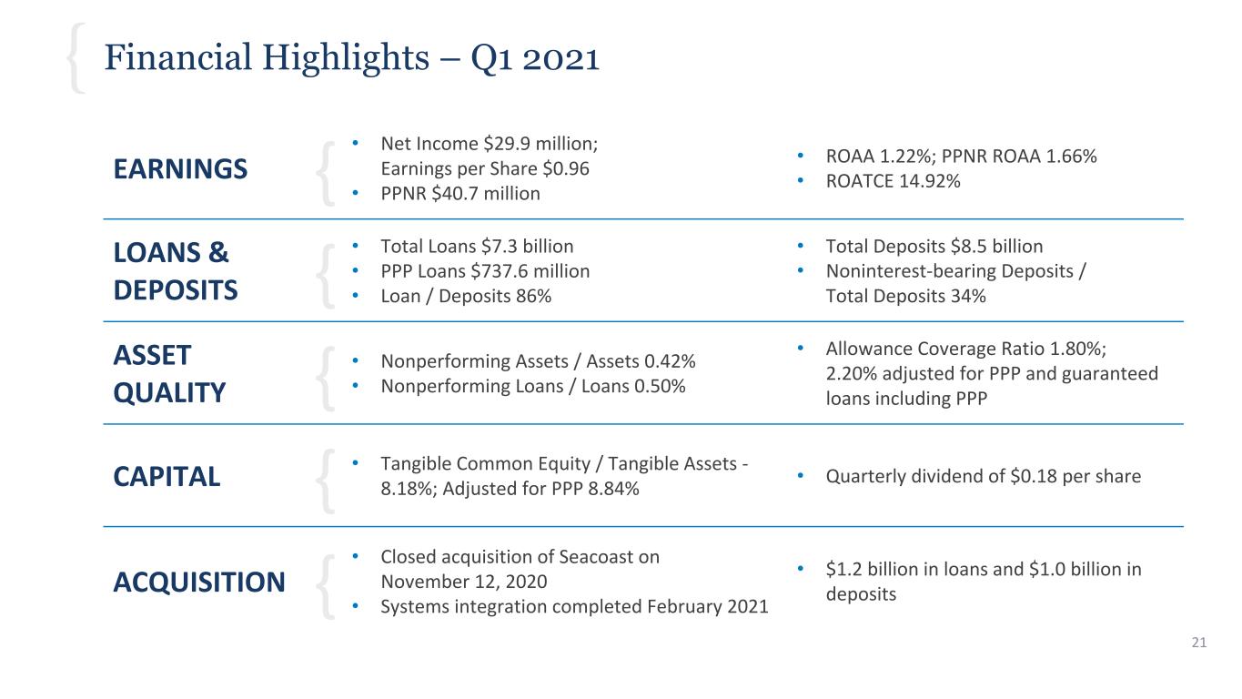 21 Financial Highlights – Q1 2021 EARNINGS { • Net Income $29.9 million; Earnings per Share $0.96 • PPNR $40.7 million • ROAA 1.22%; PPNR ROAA 1.66% • ROATCE 14.92% LOANS & DEPOSITS { • Total Loans $7.3 billion • PPP Loans $737.6 million • Loan / Deposits 86% • Total Deposits $8.5 billion • Noninterest-bearing Deposits / Total Deposits 34% ASSET QUALITY { • Nonperforming Assets / Assets 0.42%• Nonperforming Loans / Loans 0.50% • Allowance Coverage Ratio 1.80%; 2.20% adjusted for PPP and guaranteed loans including PPP CAPITAL { • Tangible Common Equity / Tangible Assets -8.18%; Adjusted for PPP 8.84% • Quarterly dividend of $0.18 per share ACQUISITION { • Closed acquisition of Seacoast on November 12, 2020 • Systems integration completed February 2021 • $1.2 billion in loans and $1.0 billion in deposits