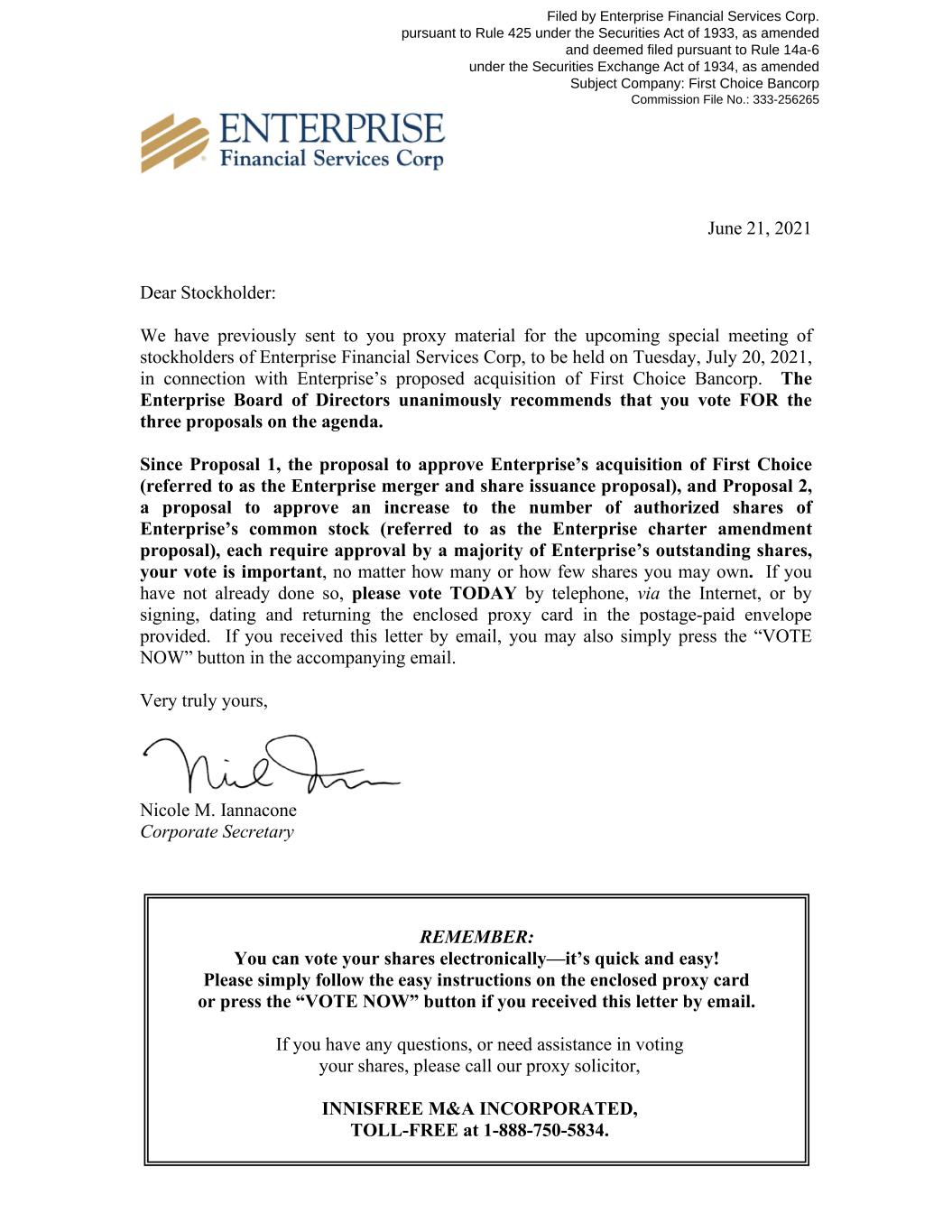 June 21, 2021 Dear Stockholder: We have previously sent to you proxy material for the upcoming special meeting of stockholders of Enterprise Financial Services Corp, to be held on Tuesday, July 20, 2021, in connection with Enterprise’s proposed acquisition of First Choice Bancorp. The Enterprise Board of Directors unanimously recommends that you vote FOR the three proposals on the agenda. Since Proposal 1, the proposal to approve Enterprise’s acquisition of First Choice (referred to as the Enterprise merger and share issuance proposal), and Proposal 2, a proposal to approve an increase to the number of authorized shares of Enterprise’s common stock (referred to as the Enterprise charter amendment proposal), each require approval by a majority of Enterprise’s outstanding shares, your vote is important, no matter how many or how few shares you may own. If you have not already done so, please vote TODAY by telephone, via the Internet, or by signing, dating and returning the enclosed proxy card in the postage-paid envelope provided. If you received this letter by email, you may also simply press the “VOTE NOW” button in the accompanying email. Very truly yours, Nicole M. Iannacone Corporate Secretary REMEMBER: You can vote your shares electronically—it’s quick and easy! Please simply follow the easy instructions on the enclosed proxy card or press the “VOTE NOW” button if you received this letter by email. If you have any questions, or need assistance in voting your shares, please call our proxy solicitor, INNISFREE M&A INCORPORATED, TOLL-FREE at 1-888-750-5834.