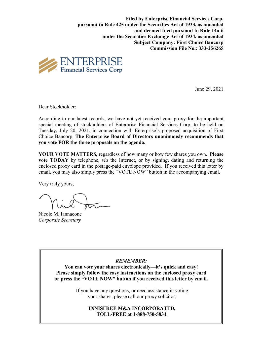 Filed by Enterprise Financial Services Corp. pursuant to Rule 425 under the Securities Act of 1933, as amended and deemed filed pursuant to Rule 14a-6 under the Securities Exchange Act of 1934, as amended Subject Company: First Choice Bancorp Commission File No.: 333-256265 June 29, 2021 Dear Stockholder: According to our latest records, we have not yet received your proxy for the important special meeting of stockholders of Enterprise Financial Services Corp, to be held on Tuesday, July 20, 2021, in connection with Enterprise’s proposed acquisition of First Choice Bancorp. The Enterprise Board of Directors unanimously recommends that you vote FOR the three proposals on the agenda. YOUR VOTE MATTERS, regardless of how many or how few shares you own. Please vote TODAY by telephone, via the Internet, or by signing, dating and returning the enclosed proxy card in the postage-paid envelope provided. If you received this letter by email, you may also simply press the “VOTE NOW” button in the accompanying email. Very truly yours, Nicole M. Iannacone Corporate Secretary REMEMBER: You can vote your shares electronically—it’s quick and easy! Please simply follow the easy instructions on the enclosed proxy card or press the “VOTE NOW” button if you received this letter by email. If you have any questions, or need assistance in voting your shares, please call our proxy solicitor, INNISFREE M&A INCORPORATED, TOLL-FREE at 1-888-750-5834.