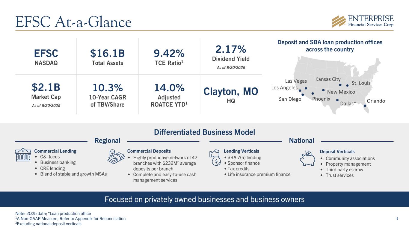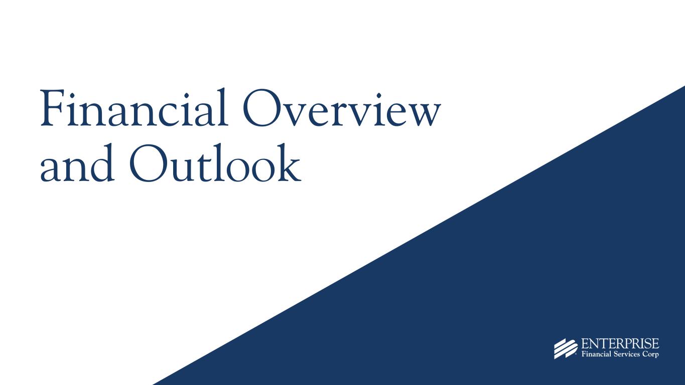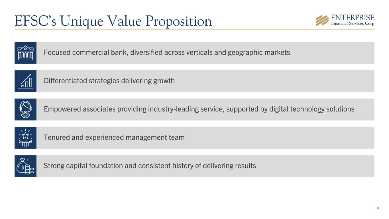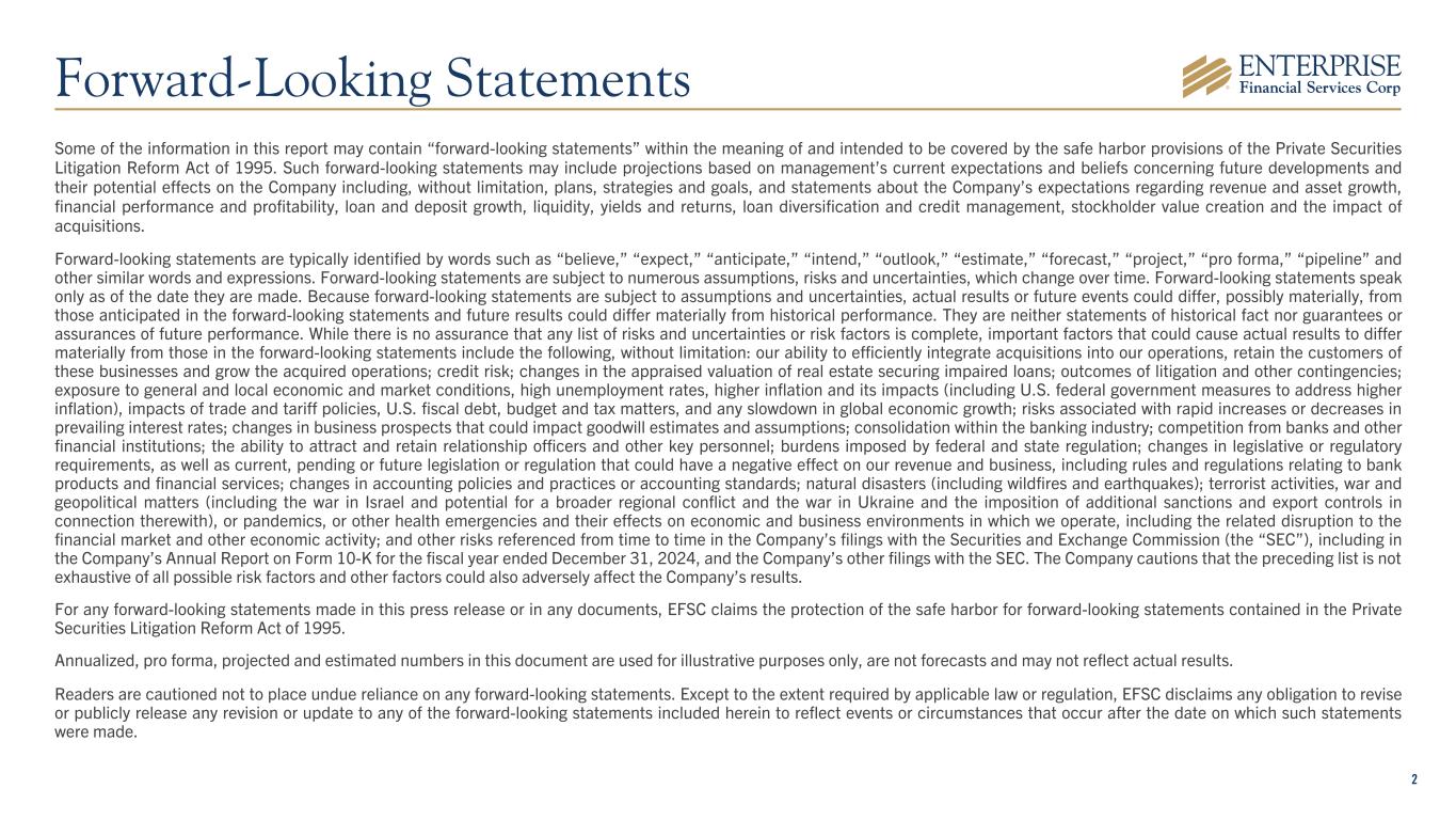 2 Forward-Looking Statements Some of the information in this report may contain “forward-looking statements” within the meaning of and intended to be covered by the safe harbor provisions of the Private Securities Litigation Reform Act of 1995. Such forward-looking statements may include projections based on management’s current expectations and beliefs concerning future developments and their potential effects on the Company including, without limitation, plans, strategies and goals, and statements about the Company’s expectations regarding revenue and asset growth, financial performance and profitability, loan and deposit growth, liquidity, yields and returns, loan diversification and credit management, stockholder value creation and the impact of acquisitions. Forward-looking statements are typically identified by words such as “believe,” “expect,” “anticipate,” “intend,” “outlook,” “estimate,” “forecast,” “project,” “pro forma,” “pipeline” and other similar words and expressions. Forward-looking statements are subject to numerous assumptions, risks and uncertainties, which change over time. Forward-looking statements speak only as of the date they are made. Because forward-looking statements are subject to assumptions and uncertainties, actual results or future events could differ, possibly materially, from those anticipated in the forward-looking statements and future results could differ materially from historical performance. They are neither statements of historical fact nor guarantees or assurances of future performance. While there is no assurance that any list of risks and uncertainties or risk factors is complete, important factors that could cause actual results to differ materially from those in the forward-looking statements include the following, without limitation: our ability to efficiently integrate acquisitions into our operations, retain the customers of these businesses and grow the acquired operations; credit risk; changes in the appraised valuation of real estate securing impaired loans; outcomes of litigation and other contingencies; exposure to general and local economic and market conditions, high unemployment rates, higher inflation and its impacts (including U.S. federal government measures to address higher inflation), impacts of trade and tariff policies, U.S. fiscal debt, budget and tax matters, and any slowdown in global economic growth; risks associated with rapid increases or decreases in prevailing interest rates; changes in business prospects that could impact goodwill estimates and assumptions; consolidation within the banking industry; competition from banks and other financial institutions; the ability to attract and retain relationship officers and other key personnel; burdens imposed by federal and state regulation; changes in legislative or regulatory requirements, as well as current, pending or future legislation or regulation that could have a negative effect on our revenue and business, including rules and regulations relating to bank products and financial services; changes in accounting policies and practices or accounting standards; natural disasters (including wildfires and earthquakes); terrorist activities, war and geopolitical matters (including the war in Israel and potential for a broader regional conflict and the war in Ukraine and the imposition of additional sanctions and export controls in connection therewith), or pandemics, or other health emergencies and their effects on economic and business environments in which we operate, including the related disruption to the financial market and other economic activity; and other risks referenced from time to time in the Company’s filings with the Securities and Exchange Commission (the “SEC”), including in the Company’s Annual Report on Form 10-K for the fiscal year ended December 31, 2024, and the Company’s other filings with the SEC. The Company cautions that the preceding list is not exhaustive of all possible risk factors and other factors could also adversely affect the Company’s results. For any forward-looking statements made in this press release or in any documents, EFSC claims the protection of the safe harbor for forward-looking statements contained in the Private Securities Litigation Reform Act of 1995. Annualized, pro forma, projected and estimated numbers in this document are used for illustrative purposes only, are not forecasts and may not reflect actual results. Readers are cautioned not to place undue reliance on any forward-looking statements. Except to the extent required by applicable law or regulation, EFSC disclaims any obligation to revise or publicly release any revision or update to any of the forward-looking statements included herein to reflect events or circumstances that occur after the date on which such statements were made.