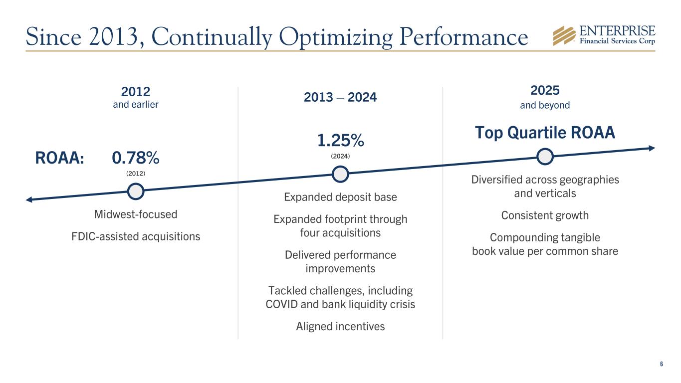 5 Differentiated Business Model Focused on privately owned businesses and business owners Commercial Deposits • Highly productive network of 42 branches with $232M2 average deposits per branch • Complete and easy-to-use cash management services Deposit Verticals • Community associations • Property management • Third party escrow • Trust services Deposit and SBA loan production offices across the country Commercial Lending • C&I focus • Business banking • CRE lending • Blend of stable and growth MSAs Lending Verticals • SBA 7(a) lending • Sponsor finance • Tax credits • Life insurance premium finance EFSC NASDAQ $16.1B Total Assets 9.42% TCE Ratio1 2.17% Dividend Yield As of 8/20/2025 $2.1B Market Cap As of 8/20/2025 10.3% 10-Year CAGR of TBV/Share 14.0% Adjusted ROATCE YTD1 Clayton, MO HQ Note: 2Q25 data; *Loan production office 1A Non-GAAP Measure, Refer to Appendix for Reconciliation 2Excluding national deposit verticals St. Louis Kansas City Phoenix New Mexico Los Angeles Las Vegas San Diego Dallas* Orlando EFSC At-a-Glance Regional National