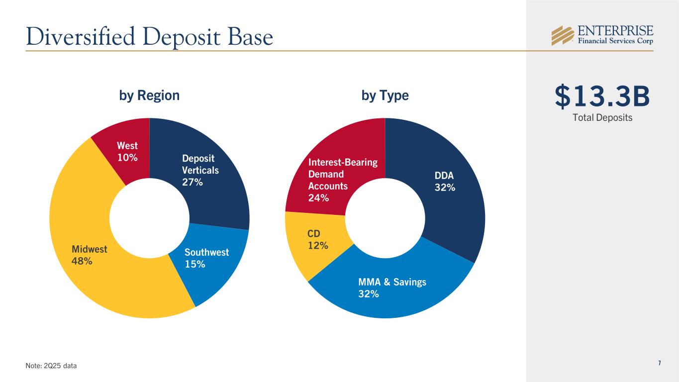 6 Midwest-focused FDIC-assisted acquisitions Expanded deposit base Expanded footprint through four acquisitions Delivered performance improvements Tackled challenges, including COVID and bank liquidity crisis Aligned incentives Diversified across geographies and verticals Consistent growth Compounding tangible book value per common share 2012 and earlier ROAA: 0.78% (2012) 1.25% (2024) 2013 – 2024 2025 and beyond Top Quartile ROAA Since 2013, Continually Optimizing Performance