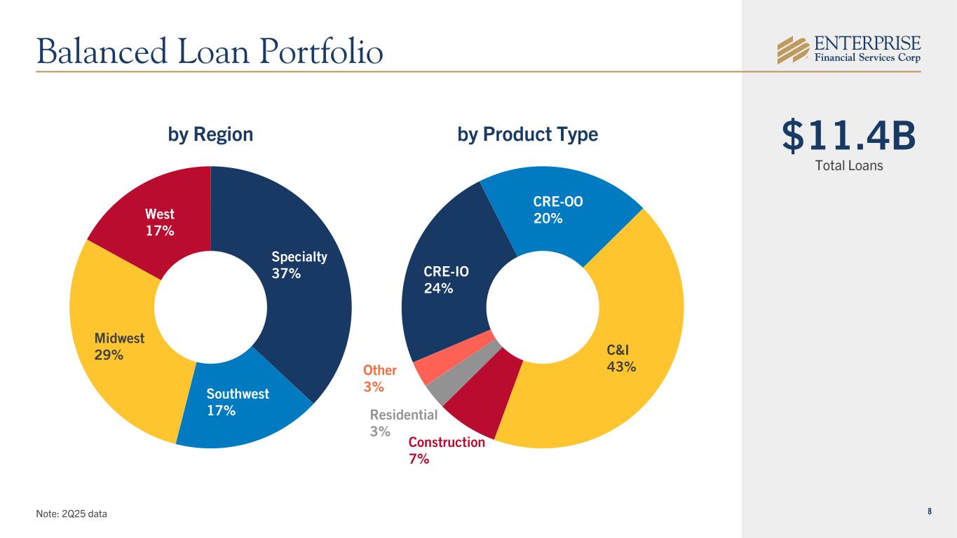 7 $13.3B Total Deposits Note: 2Q25 data Interest- Bearing Demand Accounts by Typeby Region Deposit Verticals 27% Southwest 15% Midwest 48% West 10% DDA 32% MMA & Savings 32% CD 12% Interest-Bearing Demand Accounts 24% Diversified Deposit Base