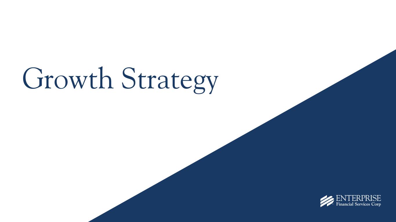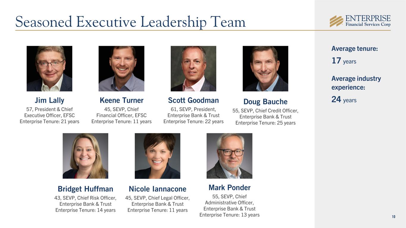 10 Jim Lally 57, President & Chief Executive Officer, EFSC Enterprise Tenure: 21 years Keene Turner 45, SEVP, Chief Financial Officer, EFSC Enterprise Tenure: 11 years Scott Goodman 61, SEVP, President, Enterprise Bank & Trust Enterprise Tenure: 22 years Doug Bauche 55, SEVP, Chief Credit Officer, Enterprise Bank & Trust Enterprise Tenure: 25 years Mark Ponder 55, SEVP, Chief Administrative Officer, Enterprise Bank & Trust Enterprise Tenure: 13 years Nicole Iannacone 45, SEVP, Chief Legal Officer, Enterprise Bank & Trust Enterprise Tenure: 11 years Bridget Huffman 43, SEVP, Chief Risk Officer, Enterprise Bank & Trust Enterprise Tenure: 14 years Average tenure: 17 years Average industry experience: 24 years Seasoned Executive Leadership Team