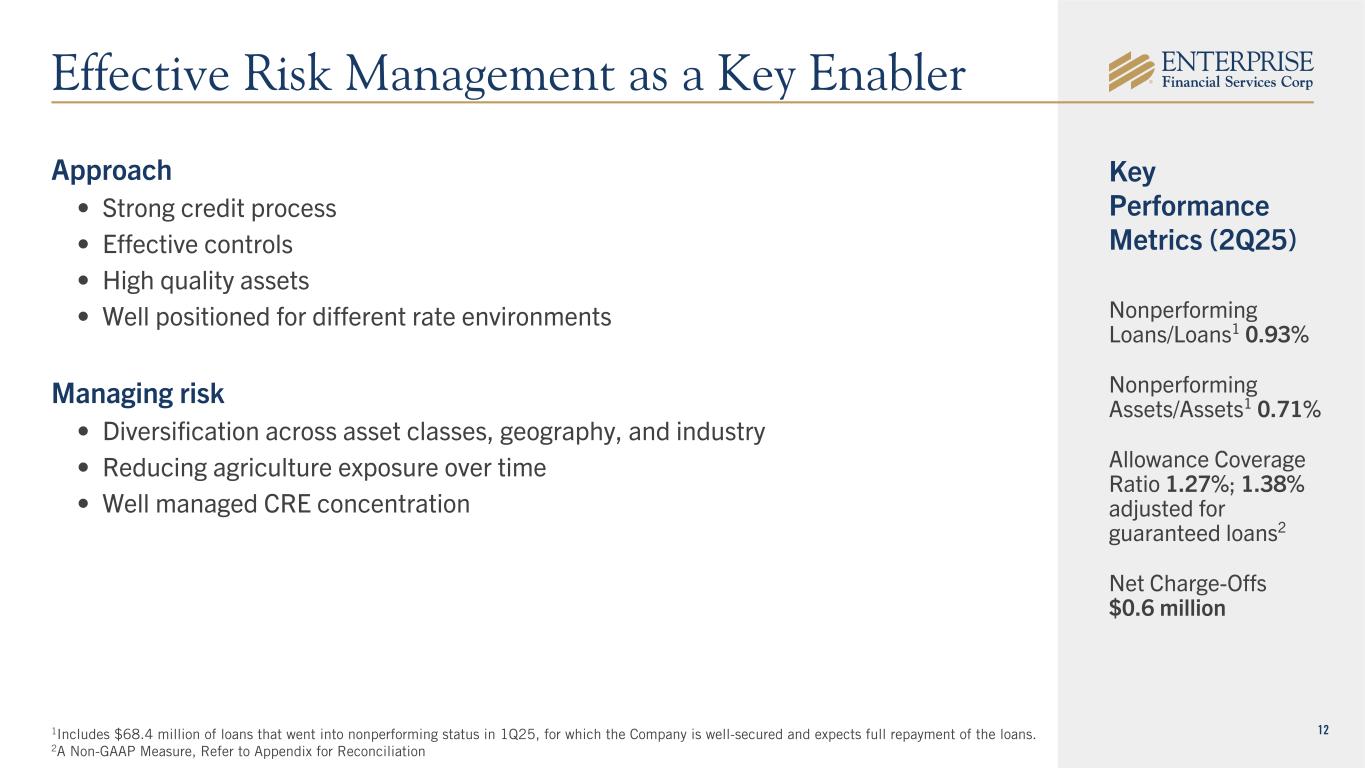 11 • Focus on process excellence, automation, and scale • Completed core system conversion in 2024 • Continuing technology investments • Focus on client experience enhancement • Relentless cost discipline • Top quartile1 performance (2Q25) Net Interest Margin 3.41% 4.18% 2021 2Q25 YTD Delivering Efficiency & Top Quartile NIM 12Q25 results for the KRX index available as of August 20, 2025. All figures are as reported by S&P. 2The year preceding the Federal Open Market Committee raising the target federal funds rate by 525 basis points. 2